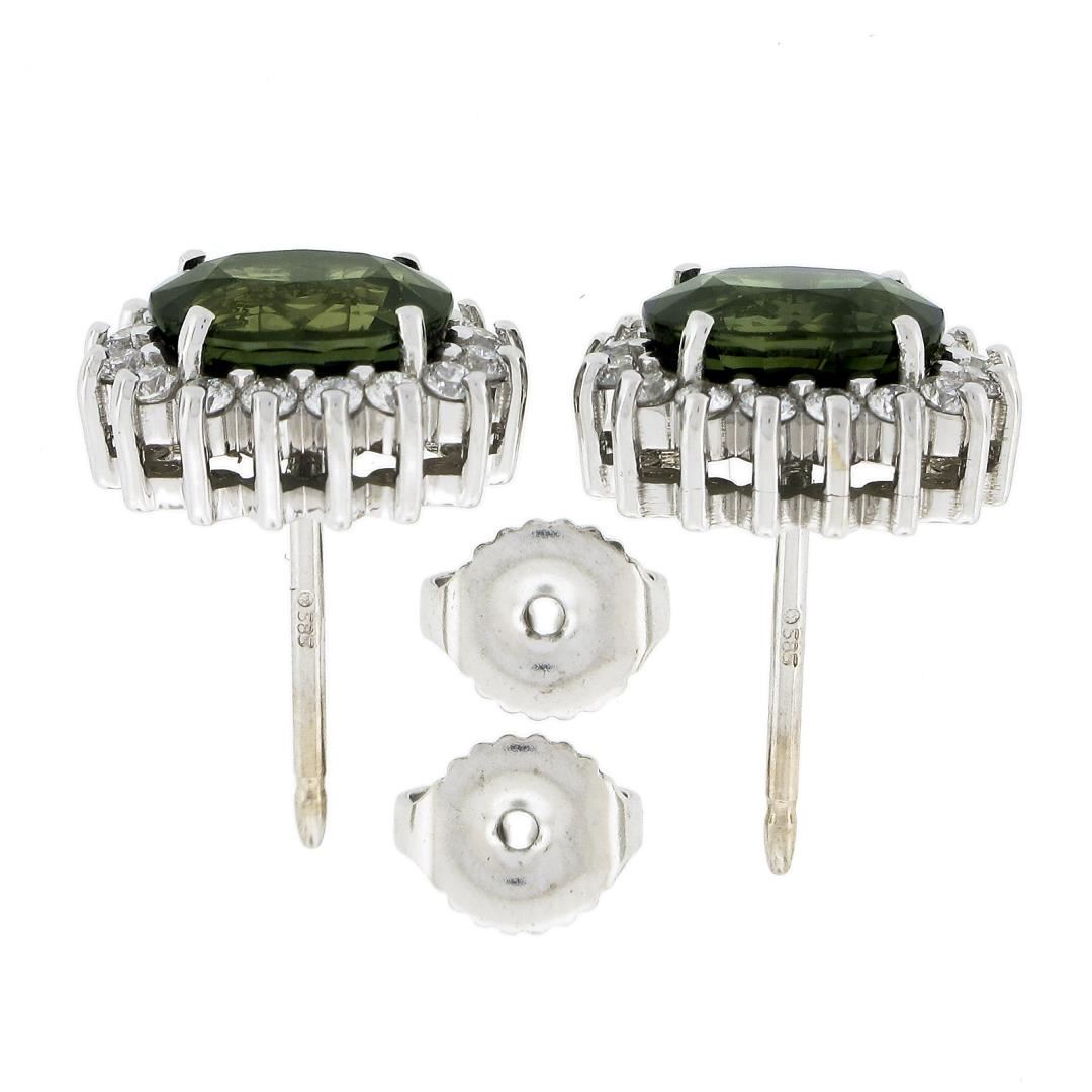 A solid 14k white gold stud earrings, with 2 oval cut natural green sapphires (8.15x6.15mm / 3.50ctw), surrounded with a halo of 32 round brilliant cut natural diamonds (G/H - VS1/VS2 ; 0.48ctw ). The earrings measure approximately 12.1x10.2mm and weigh a total of 4.96 grams.