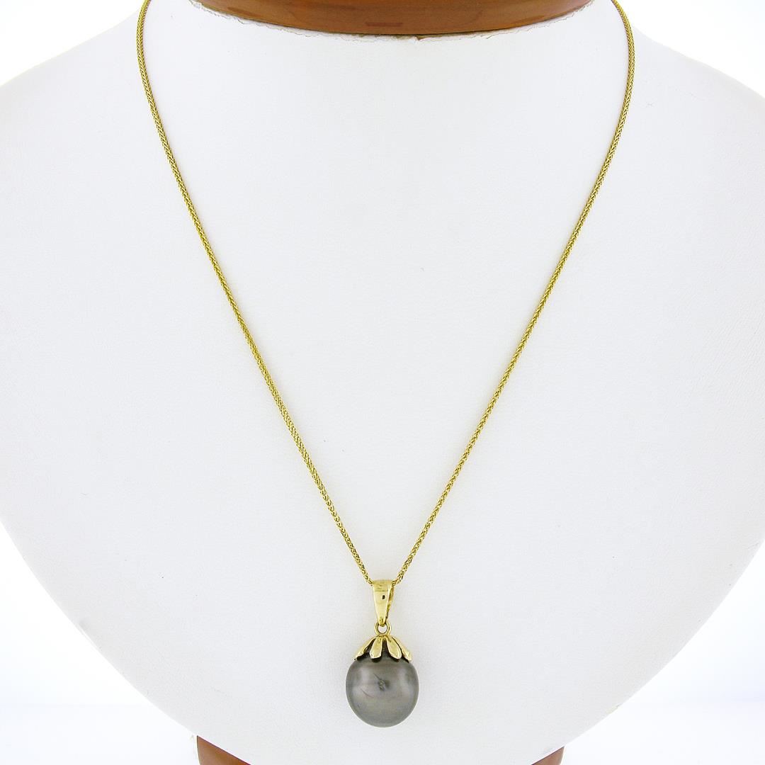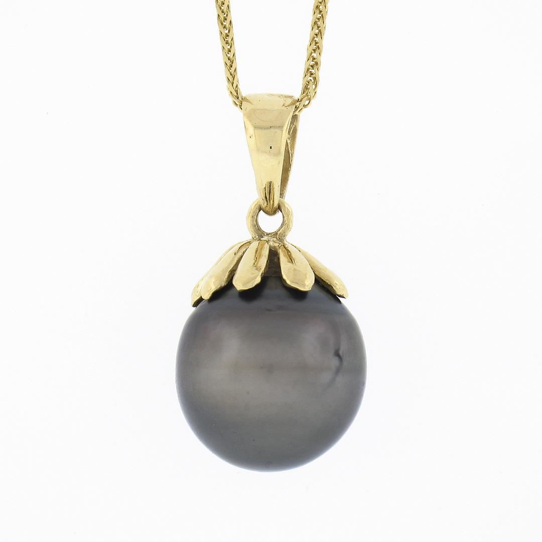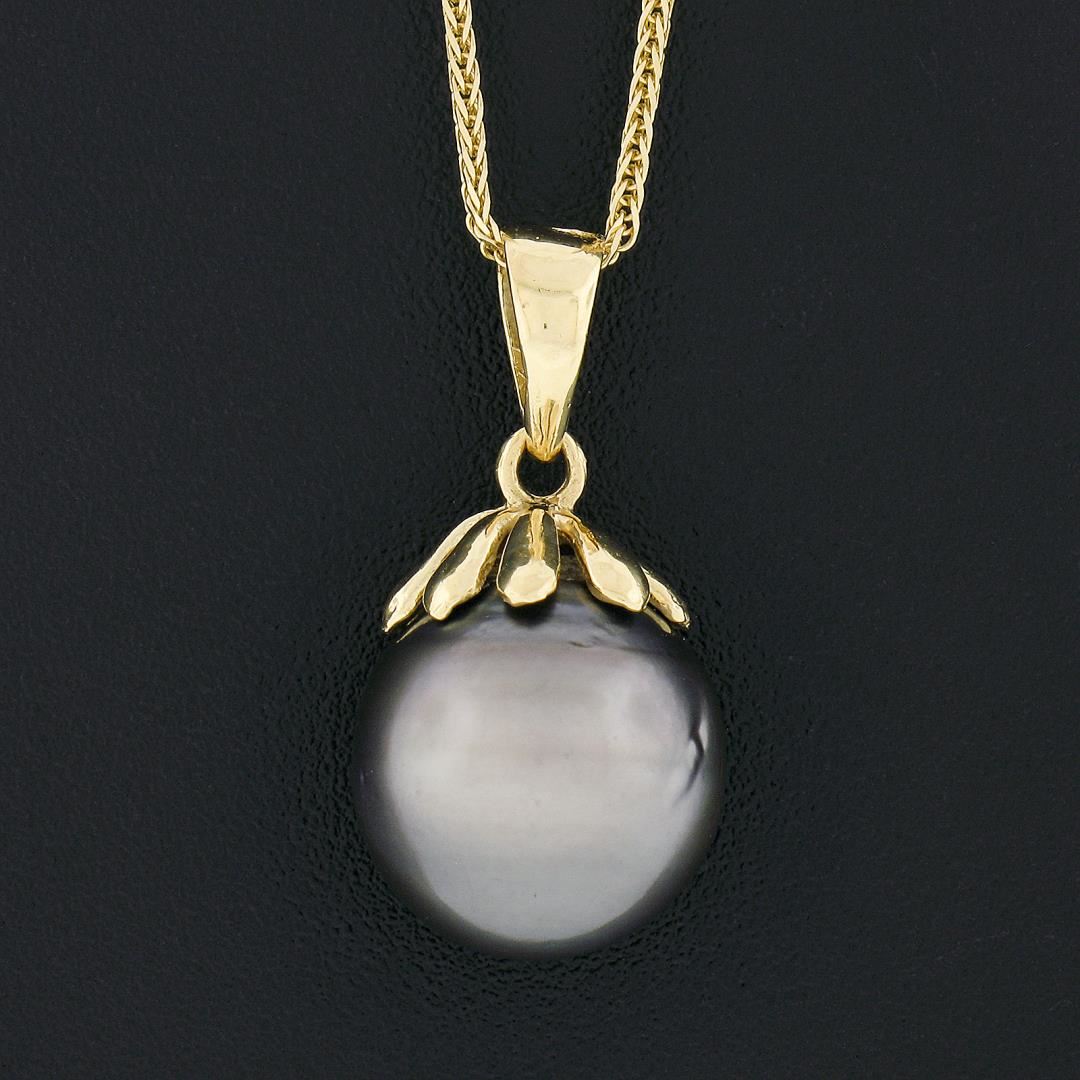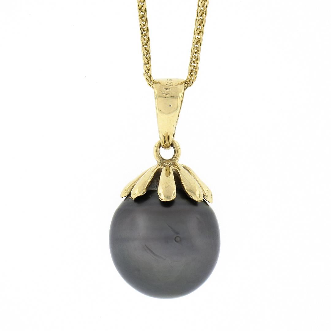 A solid 14k yellow gold pendant necklace, with 1 round shape Tahitian pearl (11.8mm). 16 inch wheat link chain, 5.21 grams total weight, pendant measures 23.6x11.8mm.
