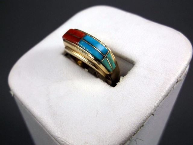 14K Yellow Gold Ring w/ Inlaid Turquoise, Coral & Blue Stones Sz 5 1/2 Weight: 7.7 Grams Retail: $1,