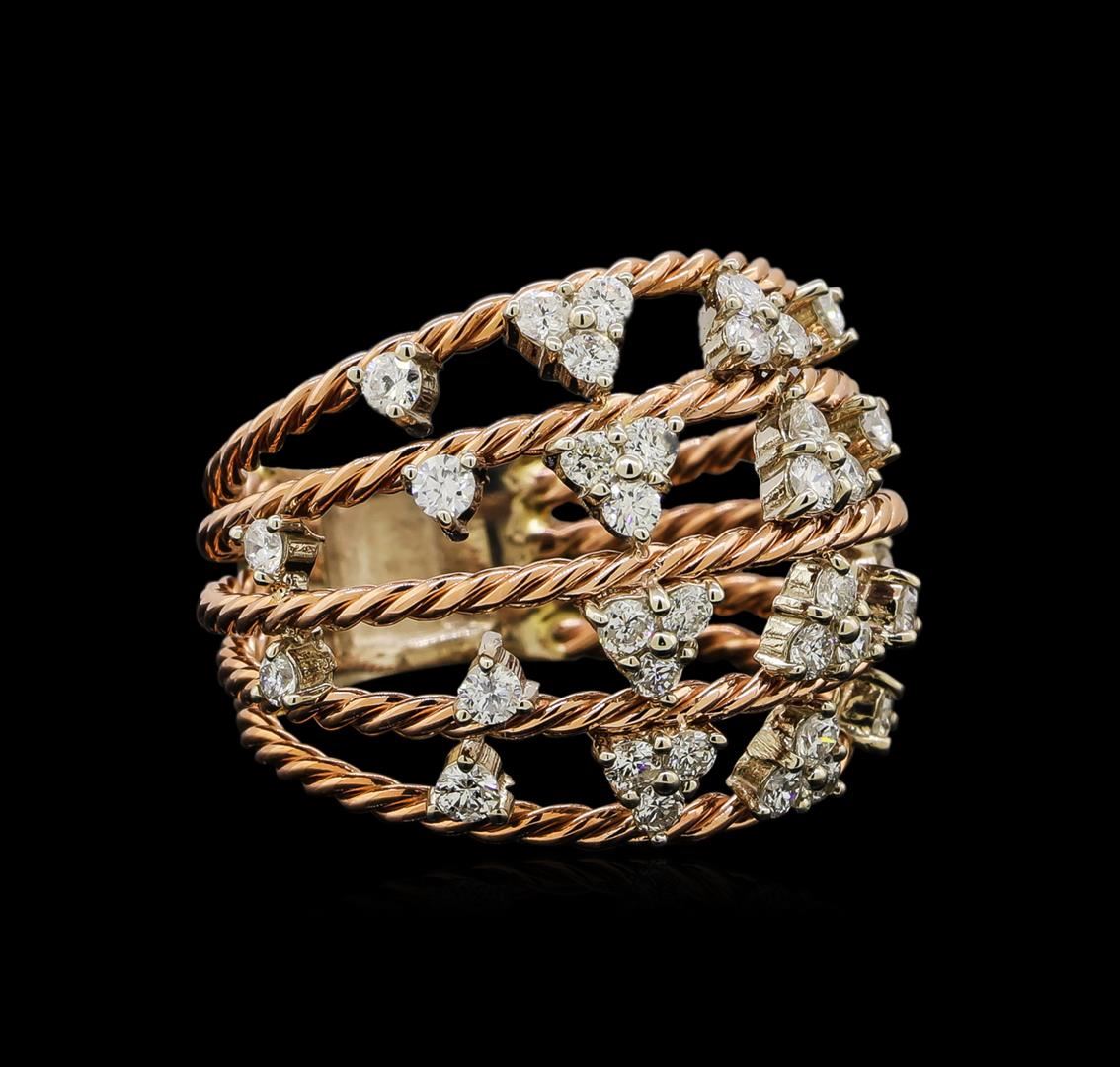 One electronically tested 14KT rose gold ladies cast diamond ring with a bright polish finish. Identified with markings of "k14". Condition is new. Containing: Thirty-Six prong set round brilliant cut diamonds, measuring 2.00 - 2.00 x 1.20mm (depth est.) approximate total weight of 36 Stones = 1.00 ct. Clarity: SI-2 to I-1. Color: I - J, Cut is Good. Diamonds are graded in the mounting, unless otherwise stated. Total Weight of Diamonds 1.00 ct. Total Weight of Ring 7.80 grams.