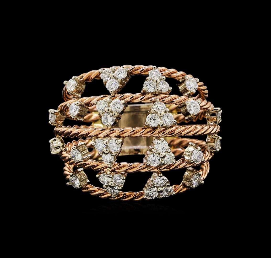 One electronically tested 14KT rose gold ladies cast diamond ring with a bright polish finish. Identified with markings of "k14". Condition is new. Containing: Thirty-Six prong set round brilliant cut diamonds, measuring 2.00 - 2.00 x 1.20mm (depth est.) approximate total weight of 36 Stones = 1.00 ct. Clarity: SI-2 to I-1. Color: I - J, Cut is Good. Diamonds are graded in the mounting, unless otherwise stated. Total Weight of Diamonds 1.00 ct. Total Weight of Ring 7.80 grams.