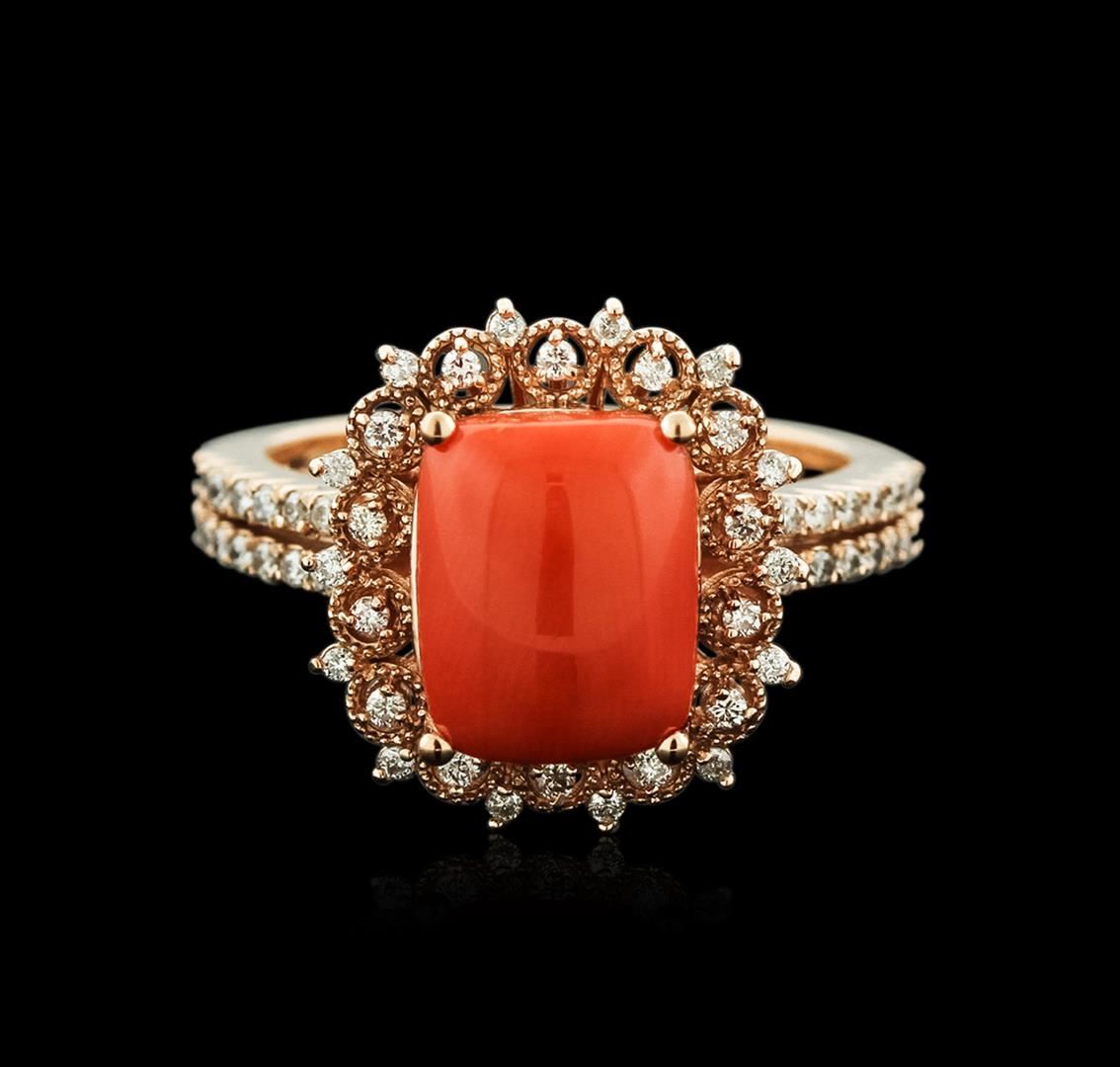 One electronically tested 14KT rose gold ladies cast coral and diamond ring with a bright polish finish. Identified with markings of "K14". Condition is new. Containing: One prong set rectangular cabochon cut natural red coral, measuring 10.10 x 8.20 x 5.33mm, approximate weight of 4.83ct., clarity is heavily included, medium light, brownish, red color, (GIA R 4/1), cut is good. Sixty prong set round brilliant cut diamonds, measuring 1.00 - 1.00 x 0.60mm (depth est.) approximate total weight of 60 Stones = 0.22ct. Clarity: I-1 to I-2. Color: H - I, Cut is Good. Colored gemstones are presumed to have been subjected to commonly used enhancement processes. All diamonds and colored gemstones are graded in the mounting, unless otherwise stated. Total Weight of Colored Stones 4.83ct. Total Weight of Diamonds 0.22ct. Total Weight of Ring 5.30 grams. GGL Appraised at $2,490.00.
