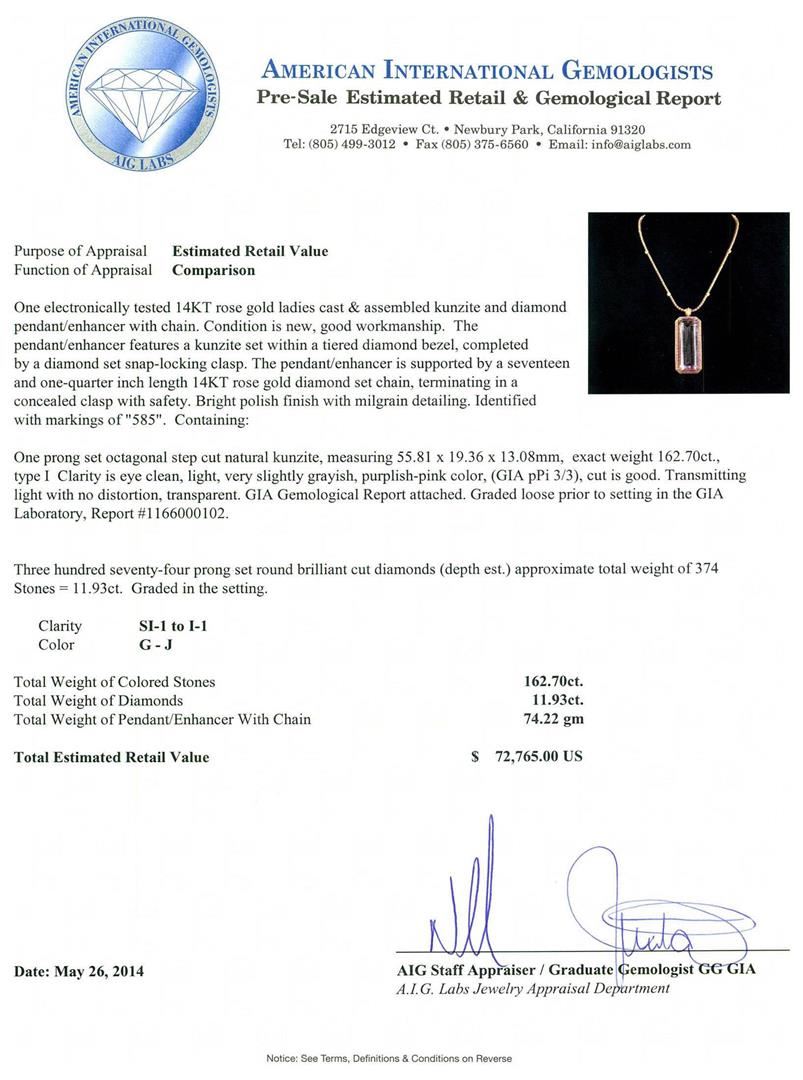 One electronically tested 14KT rose gold ladies cast & assembled kunzite and diamond pendant/enhancer with chain. Condition is new, good workmanship. The pendant/enhancer features a kunzite set within a tiered diamond bezel, completed by a diamond set snap-locking clasp. The pendant/enhancer is supported by a seventeen and one-quarter inch length 14KT rose gold diamond set chain, terminating in a concealed clasp with safety. Bright polish finish with milgrain detailing. Identified with markings of "585". Containing: One prong set octagonal step cut natural kunzite, measuring 55.81 x 19.36 x 13.08mm, exact weight 162.70 ct., type I Clarity is eye clean, light, very slightly grayish, purplish-pink color, (GIA pPi 3/3), cut is good. Transmitting light with no distortion, transparent. GIA Gemological Report attached. Graded loose prior to setting in the GIA Laboratory, Report #1166000102.Three Hundred Seventy-Four prong set round brilliant cut diamonds (depth est.) approximate. Total Weight of 374 Stones = 11.93ct. Graded in the setting. Clarity: SI-1 to I-1. Color: G - J. Total Weight of Colored Stones162.70 ct. Total Weight of Diamonds 11.93ct. Total Weight of Pendant/Enhancer With Chain 74.22 grams. AIG Appraised.