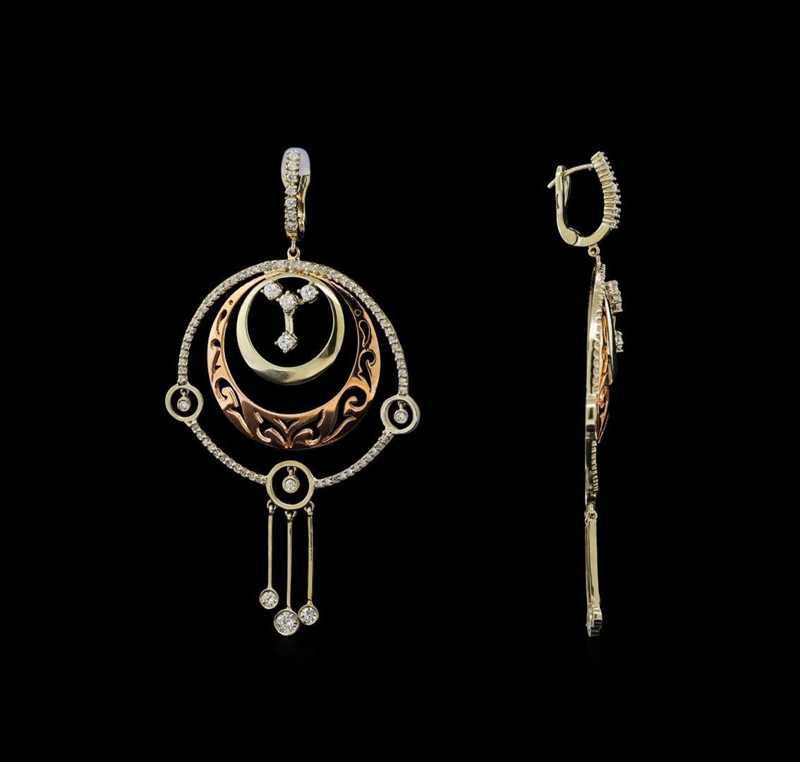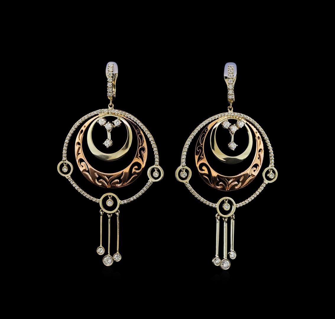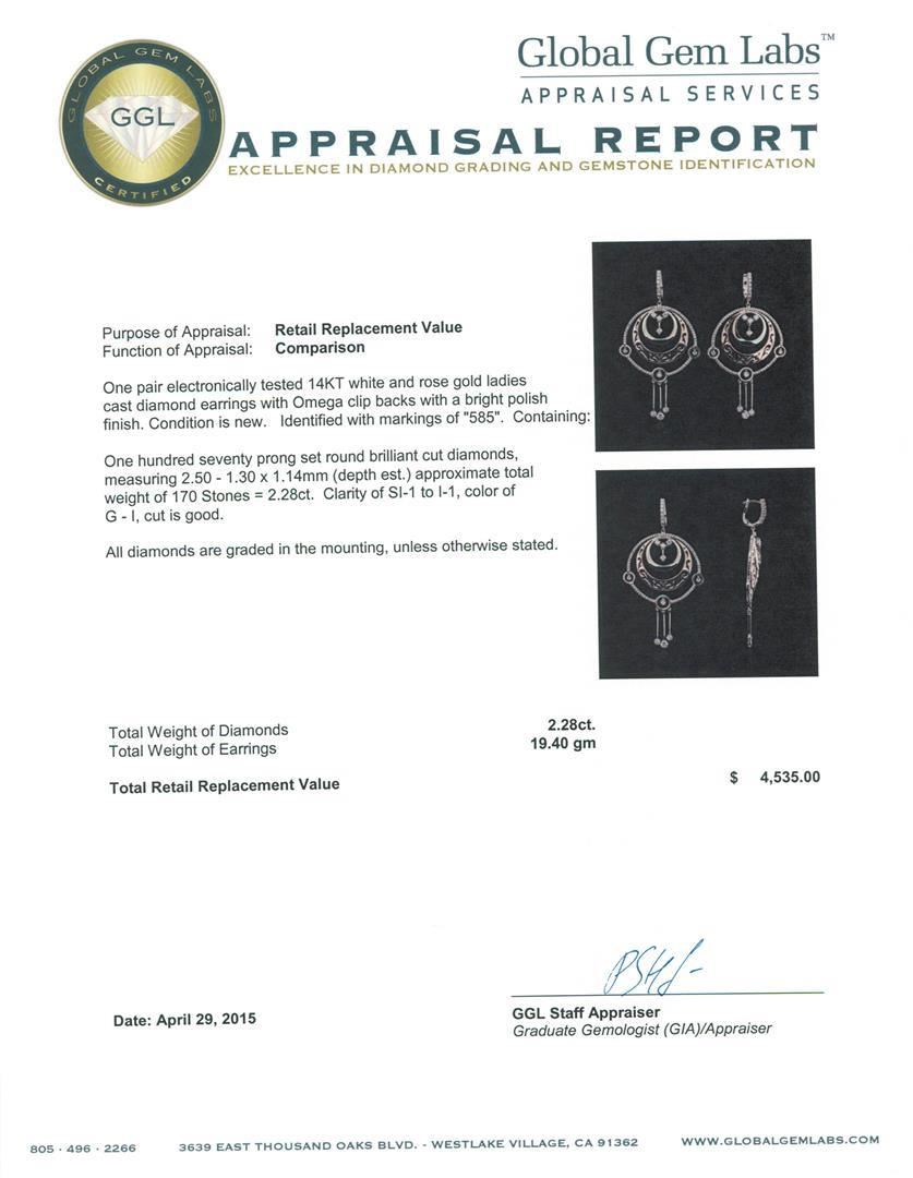 One pair electronically tested 14KT white and rose gold ladies cast diamond earrings with Omega clip backs with a bright polish finish. Identified with markings of "585". Condition is new. Containing: One Hundred Seventy prong set round brilliant cut diamonds, measuring 2.50 - 1.30 x 1.14mm (depth est.) approximate total weight of 170 Stones = 2.28ct. Clarity: SI-1 to I-1. Color: G - I, Cut is Good. All diamonds are graded in the mounting, unless otherwise stated. Total Weight of Diamonds 2.28ct. Total Weight of Earrings 19.40 grams. GGL Appraised.