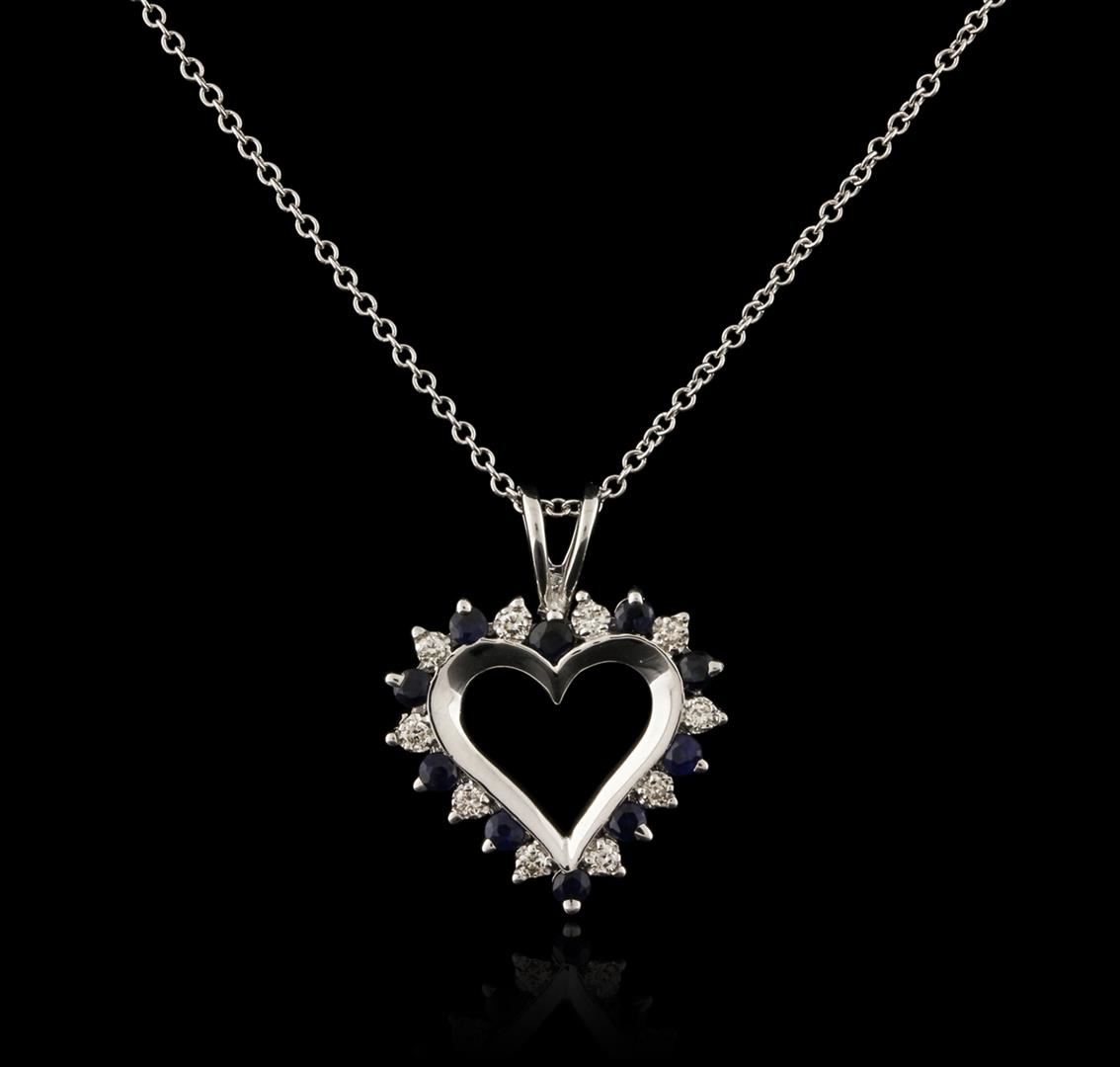 One heart pendant with chain featuring: 14KT white gold weighing 2.82 grams containing blue sapphires with a total weight of 0.10ct and prong set round diamonds with a total weight of 0.10ct.
