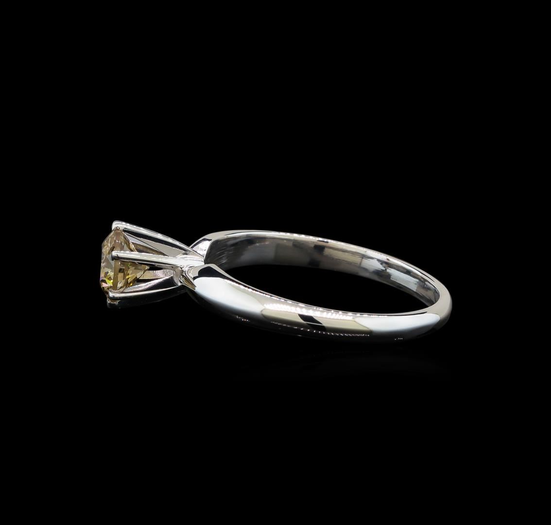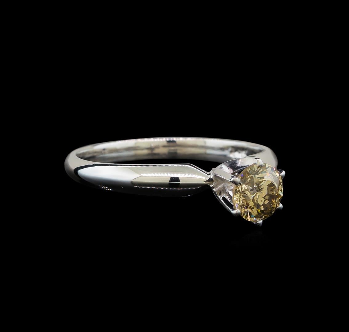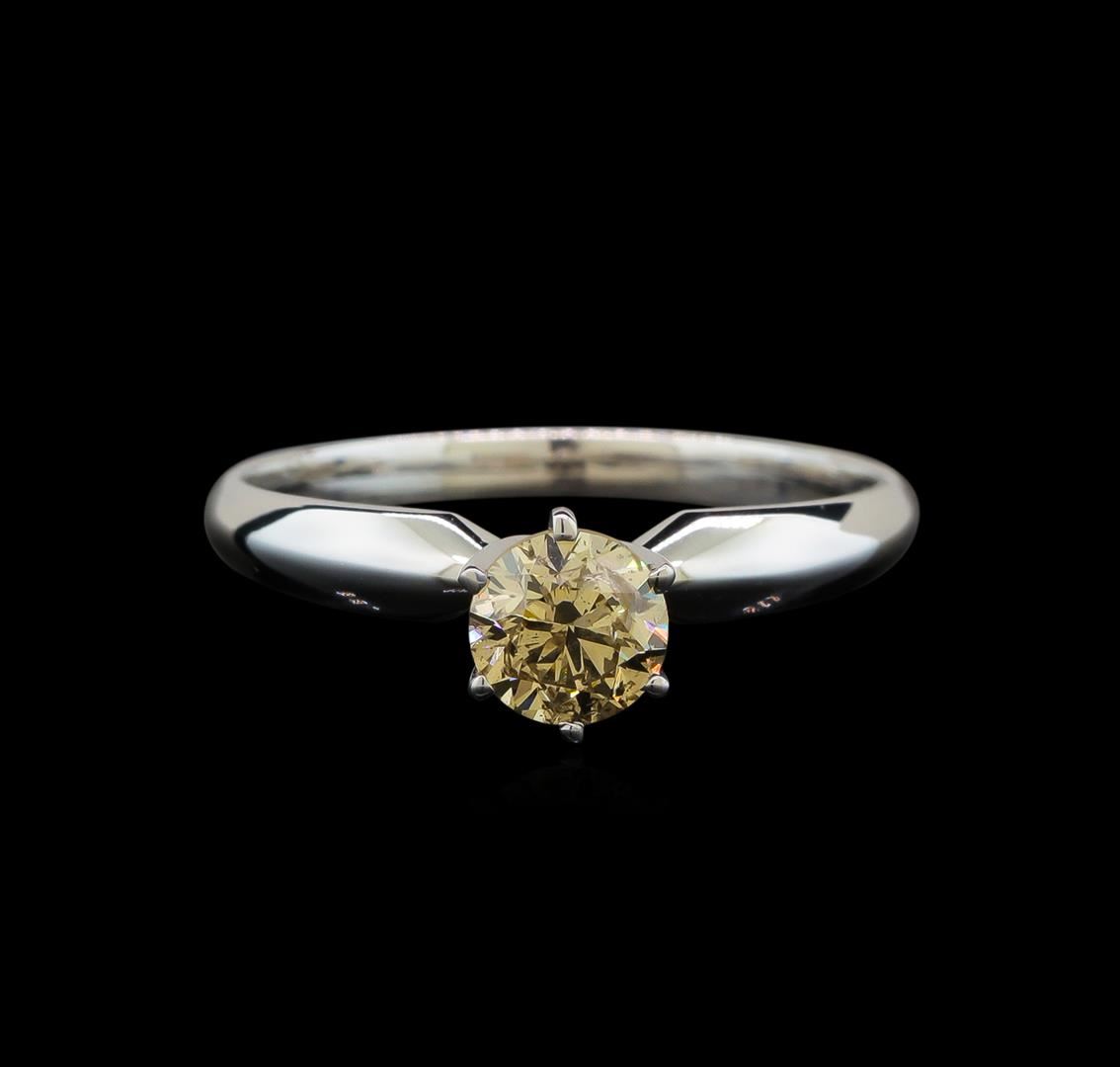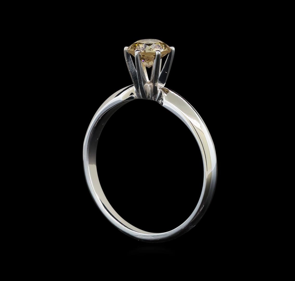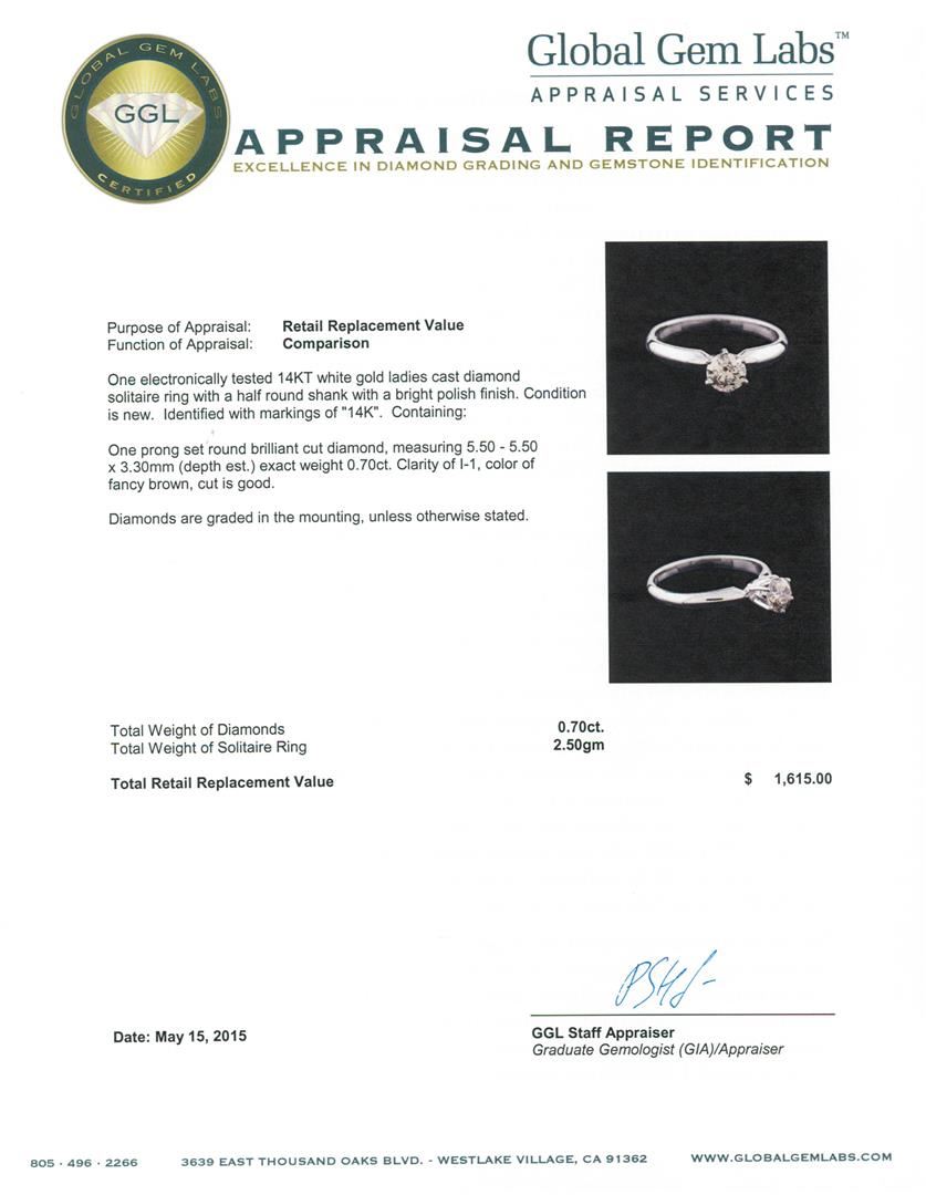 One electronically tested 14KT white gold ladies cast diamond solitaire ring with a half round shank with a bright polish finish. Identified with markings of "14K". Condition is new. Containing: One prong set round brilliant cut diamond, measuring 5.50 - 5.50 x 3.30mm (depth est.) exact weight 0.70 ct. Clarity: I-1, Cut is Good. Diamonds are graded in the mounting, unless otherwise stated. Total Weight of Diamonds 0.70 ct. Total Weight of Solitaire Ring 2.50 grams. GGL Appraised.