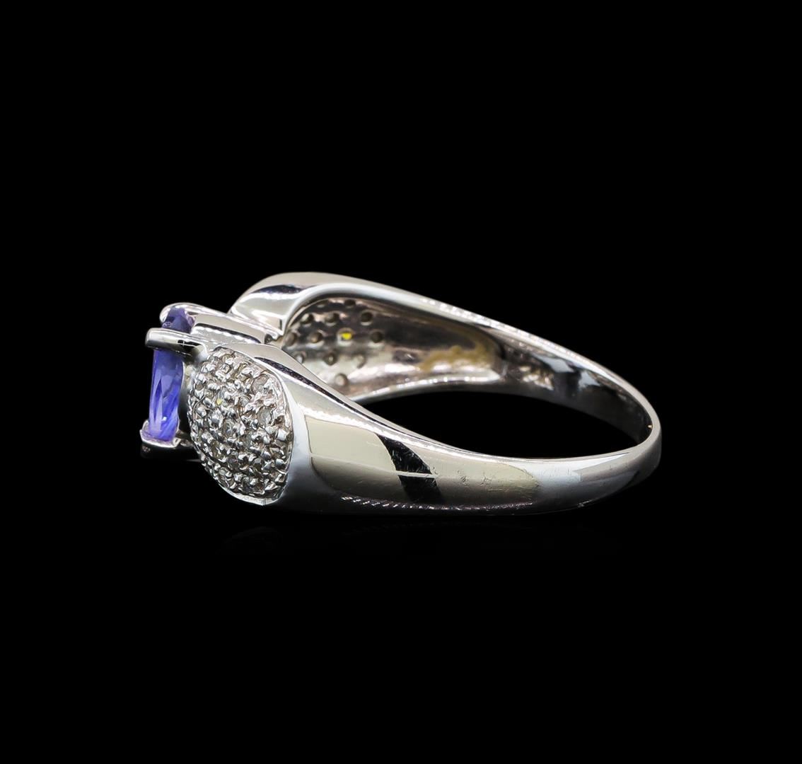 One electronically tested 14KT white gold ladies cast tanzanite and diamond ring with a bright polish finish. Identified with markings of "14K". Condition is new. Containing: One prong set pear modified brilliant cut natural tanzanite, measuring 6.40 x 5.00 x 3.25mm, approximate weight of 0.70 ct., clarity is eye clean, type I, medium light, very slightly grayish, violet color, (GIA V 4/3), cut is good. Fifty-Four prong set single cut diamonds, measuring 1.00 - 1.00 x 0.60mm (depth est.) approximate total weight of 54 Stones = 0.19ct. Clarity: I-1 to I-2. Color: I - J. Colored gemstones are presumed to have been subjected to commonly used enhancement processes. All diamonds and colored gemstones are graded in the mounting, unless otherwise stated. Total Weight of Colored Stones 0.70 ct. Total Weight of Diamonds 0.19ct. Total Weight of Ring 3.90 grams. GGL Appraised.