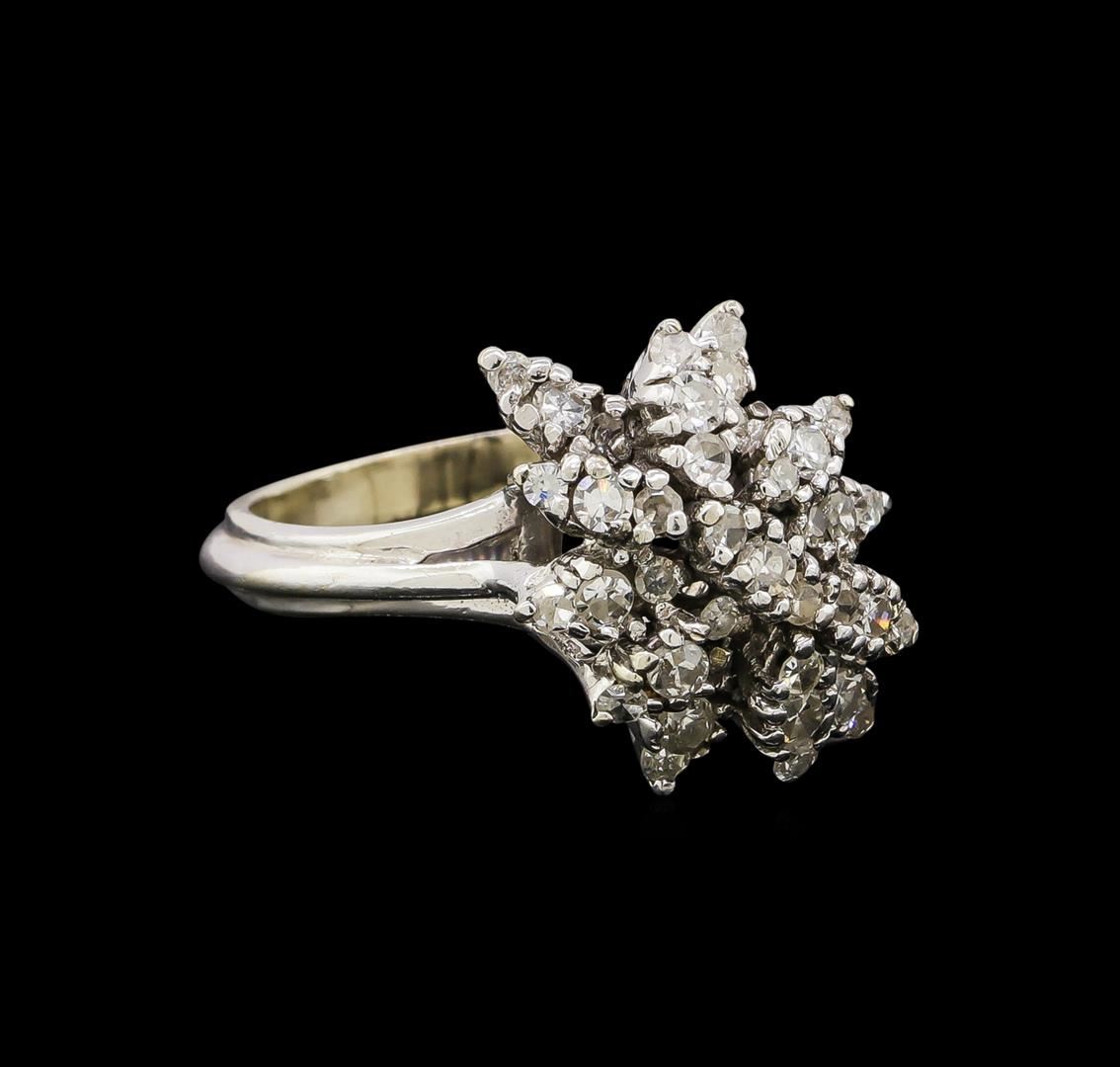 One electronically tested 14KT white gold ladies cast diamond ring with a bright polish finish. The ring features an stylized floral cluster, completed by a grooved two and one-half millimeter wide band. Identified with markings of "14K". Condition is good. Containing: Thirteen prong set single cut diamonds, measuring 2.20 - 2.10 x 1.29mm (depth est.) approximate total weight of 13 Stones = 0.50 ct. Graded in the setting. Clarity: SI-1 to I-1. Color: H - J Twenty-Six prong set single cut diamonds, measuring 1.70 - 1.60 x 0.99mm (depth est.) approximate total weight of 26 Stones = 0.45ct. Graded in the setting. Clarity: SI-1 to I-1. Color: H - J. Total Weight of Diamonds 0.95ct. Total Weight of Ring 6.79 grams. AIG Appraised.