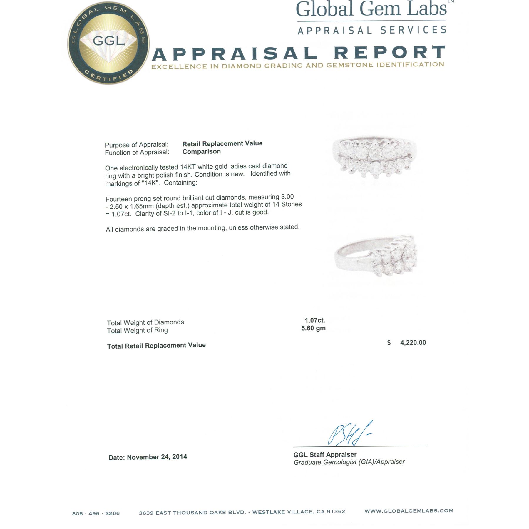 One electronically tested 14KT white gold ladies cast diamond ring with a bright polish finish. Identified with markings of "14K". Condition is new. Containing: Fourteen prong set round brilliant cut diamonds, measuring 3.00 - 2.50 x 1.65mm (depth est.) approximate total weight of 14 Stones = 1.07ct. Clarity: SI-2 to I-1. Color: I - J, Cut is Good. All diamonds are graded in the mounting, unless otherwise stated. Total Weight of Diamonds 1.07ct. Total Weight of Ring 5.60 grams. GGL Appraised.