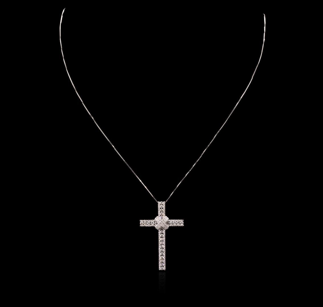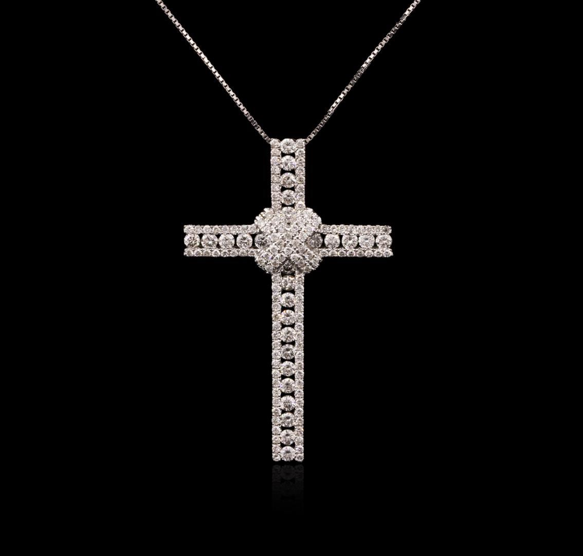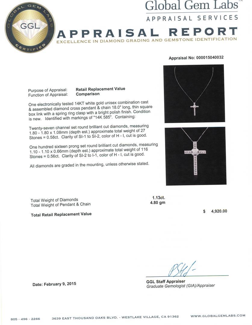 One electronically tested 14KT white gold unisex combination cast & assembled diamond cross pendant & chain 18.0" long, thin square box link with a spring ring clasp with a bright polish finish. Identified with markings of "14K 585". Condition is new. Containing: Twenty-Seven channel set round brilliant cut diamonds, measuring 1.80 - 1.80 x 1.08mm (depth est.) approximate total weight of 27 Stones = 0.58ct. Clarity: SI-1 to SI-2. Color: H - I, Cut is Good. One Hundred Sixteen prong set round brilliant cut diamonds, measuring 1.10 - 1.10 x 0.66mm (depth est.) approximate total weight of 116 Stones = 0.56ct. Clarity: SI-2 to I-1. Color: H - I, Cut is Good. All diamonds are graded in the mounting, unless otherwise stated. Total Weight of Diamonds 1.13ct. Total Weight of Pendant & Chain 4.80 grams. GGL Appraised at $4,920.00.