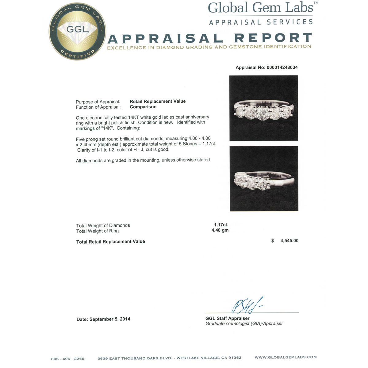 One electronically tested 14KT white gold ladies cast anniversary ring with a bright polish finish. Identified with markings of "14K". Condition is new. Containing: Five prong set round brilliant cut diamonds, measuring 4.00 - 4.00 x 2.40mm (depth est.) approximate total weight of 5 Stones = 1.17ct. Clarity: I-1 to I-2. Color: H - J, Cut is Good. All diamonds are graded in the mounting, unless otherwise stated. Total Weight of Diamonds 1.17ct. Total Weight of Ring 4.40 grams. GGL Appraised at $4,545.00.
