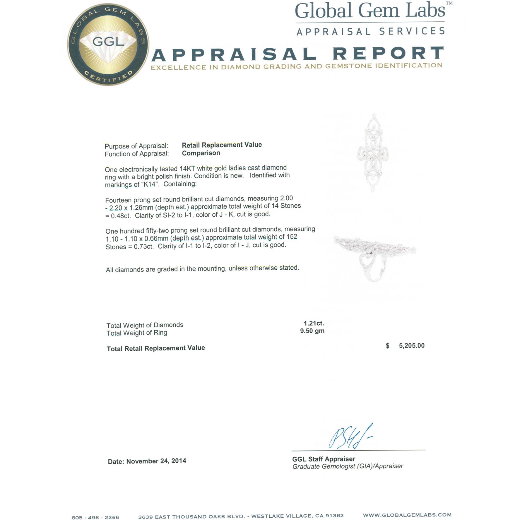 One electronically tested 14KT white gold ladies cast diamond ring with a bright polish finish. Identified with markings of "K14". Condition is new. Containing: Fourteen prong set round brilliant cut diamonds, measuring 2.00 - 2.20 x 1.26mm (depth est.) approximate total weight of 14 Stones = 0.48ct. Clarity: SI-2 to I-1. Color: J - K, Cut is Good. One Hundred Fifty-Two prong set round brilliant cut diamonds, measuring 1.10 - 1.10 x 0.66mm (depth est.) approximate total weight of 152 Stones = 0.73ct. Clarity: I-1 to I-2. Color: I - J, Cut is Good. All diamonds are graded in the mounting, unless otherwise stated. Total Weight of Diamonds 1.21ct. Total Weight of Ring 9.50 grams. GGL Appraised.