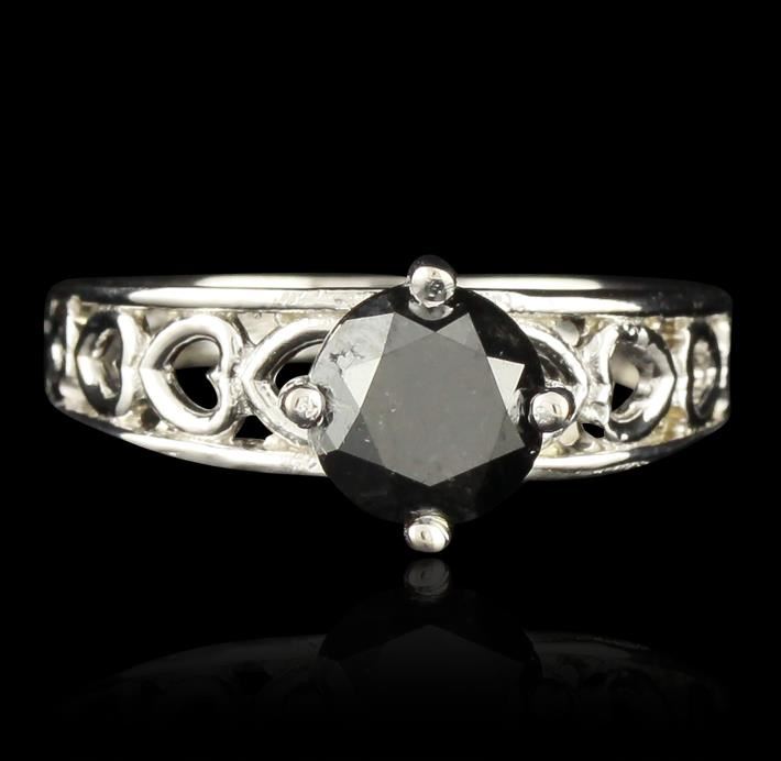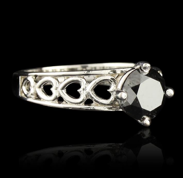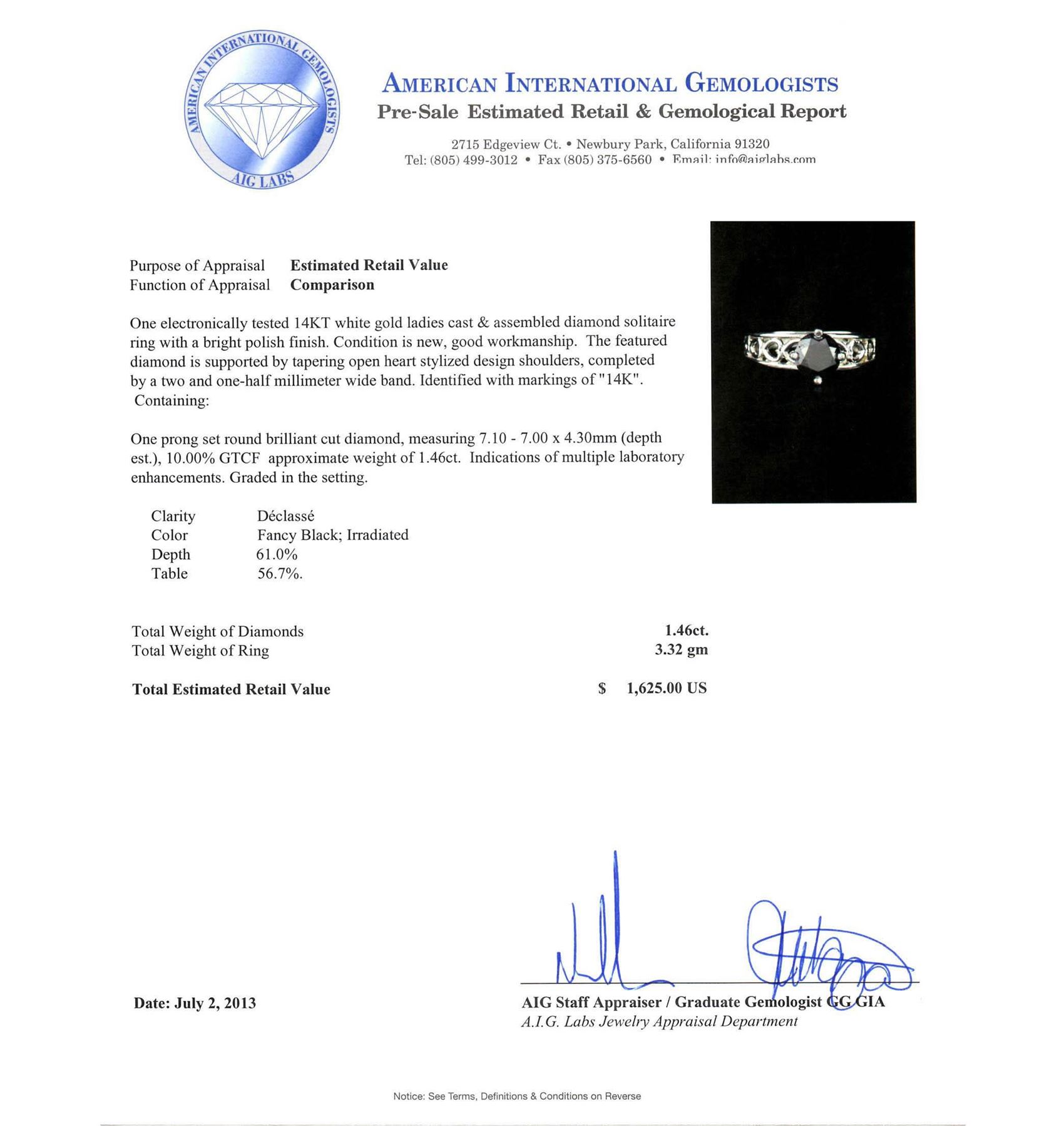One electronically tested 14KT white gold ladies cast & assembled diamond solitaire ring with a bright polish finish. Condition is new, good workmanship. The featured diamond is supported by tapering open heart stylized design shoulders, completed by a two and one-half millimeter wide band. Identified with markings of "14K". Containing: One prong set round brilliant cut diamond, measuring 7.10 -- 7.00 x 4.30mm (depth est.), 10.00% GTCF approximate weight of 1.46ct. Indications of multiple laboratory enhancements. Graded in the setting. Clarity Declasse. Color Fancy Black; Irradiated. Depth 61.0%. Table 56.7%. Total Weight of Diamonds 1.46ct. Total Weight of Ring 3.32gm..