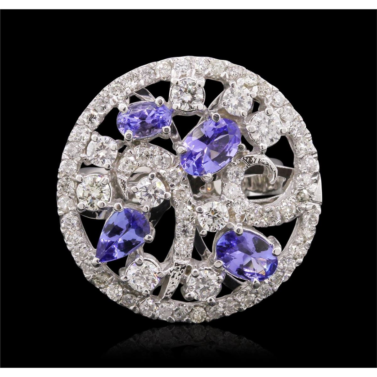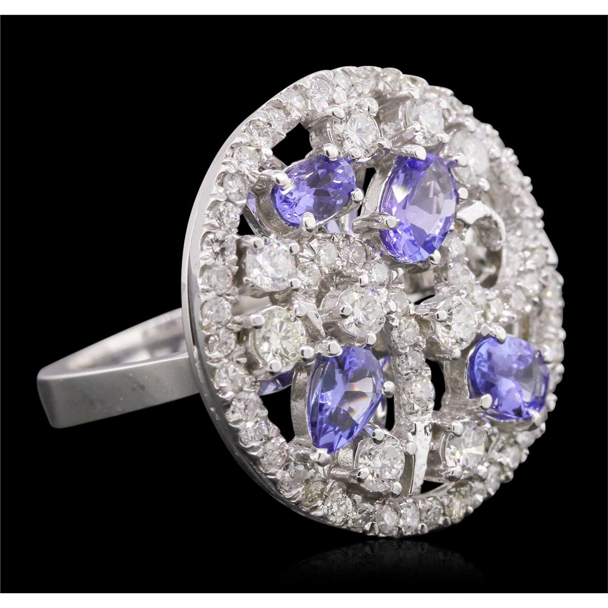 One electronically tested 14KT white gold ladies cast tanzanite and diamond ring with a bright polish finish. Condition is new, good workmanship. The ring features a bouquet of tanzanite and diamonds, completed by a three millimeter wide band. Identified with markings of "K14". Containing: Four prong set pear and oval mixed cut natural tanzanites approximate. Total Weight of 1.67ct., clarity is eye clean, type I, medium dark, very slightly grayish, bluish violet color, (GIA bV 6/3), cut is good. Transmitting light with no distortion, transparent. Color grade is an average for the group. Graded in the setting. Tanzanite is a very rare gemstone that is only found in the country of Tanzania. Originally discovered in 1967. Tiffany & Company, named the stone Tanzanite. It is found in the Usumburu Mountains that border the Umba Valley of northern Tanzania. Tanzanite occurs in gray, brown, violet, blue, reddish-purple, & green. The gem is interesting because of its exceptional pleochroism. Rotated in different directions a tanzanite will exhibit multiple changes of color. Tanzanite has a low tolerance to ultrasonic cleaning, and should not be cleaned using this method. Nine prong set round brilliant cut diamonds, measuring 2.90 - 2.70 x 1.68mm (depth est.) approximate. Total Weight of 9 Stones = 0.83ct. Graded in the setting. Clarity: SI-2 to I-1 . Color: F - H Fifty-Eight prong set round brilliant cut diamonds, measuring 1.60 - 1.50 x 0.93mm (depth est.) approximate. Total Weight of 58 Stones = 0.88ct. Graded in the setting. Clarity: SI-2 to I-2 . Color: F - H. Total Weight of Colored Stones 1.67ct.. Total Weight of Diamonds 1.71ct.. Total Weight of Ring 9.80gm. AIG Appraised at $8,440.00.
