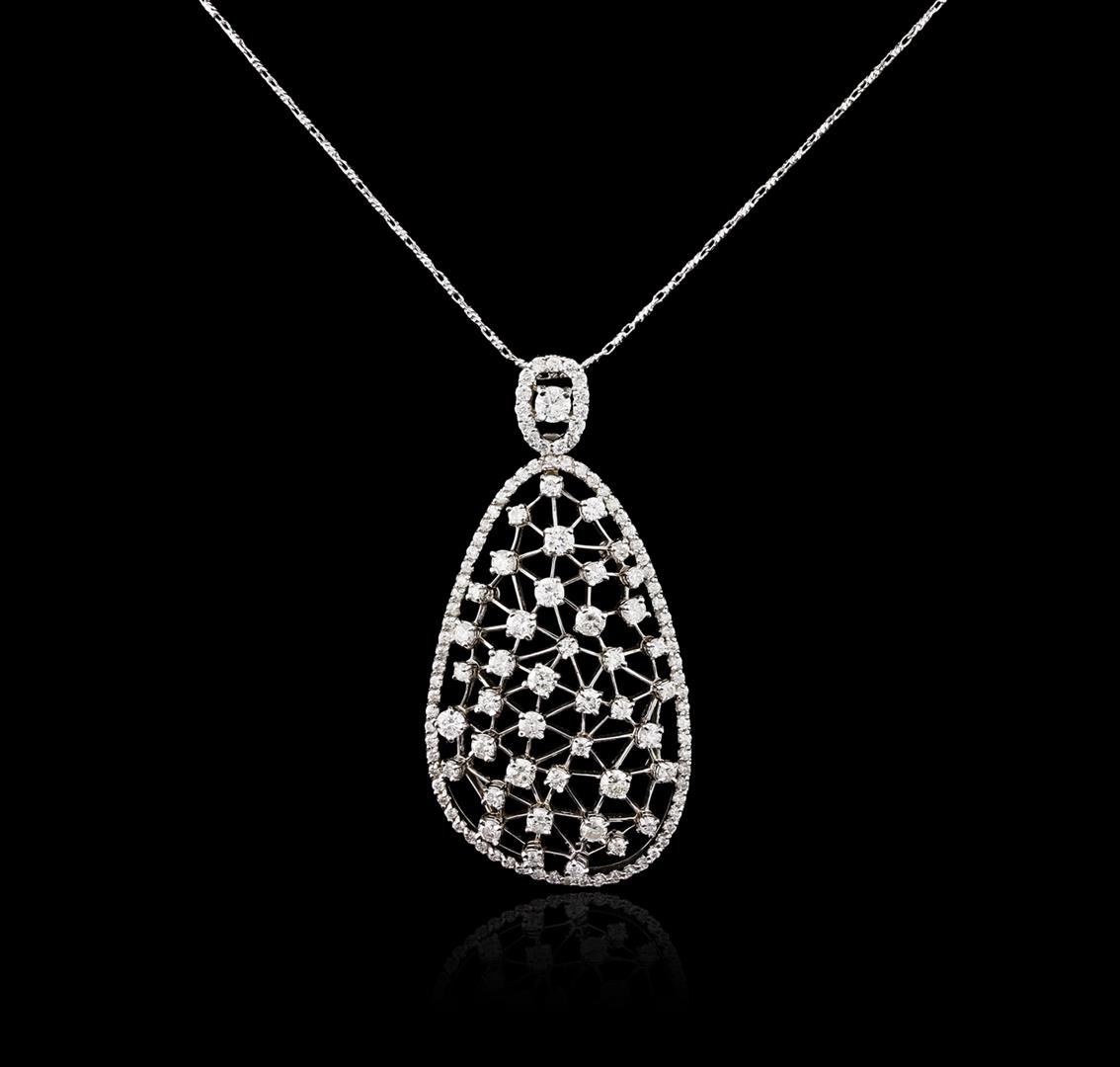 One electronically tested 14KT white gold ladies cast diamond pendant & chain 18.0" long, with a lobster claw clasp with a bright polish finish. Identified with markings of "14K". Condition is new. Containing: One prong set round brilliant cut diamond, measuring 3.00. - 3.00. x 1.80mm (depth est.) approximate weight of 0.10ct. Clarity: I-2. Color: I. Thirty-Five prong set round brilliant cut diamonds, measuring 2.50 - 1.50 x 1.20mm (depth est.) approximate total weight of 35 Stones = 1.02ct. Clarity: SI-1 to I-1. Color: I - J. One Hundred Fourteen prong set round brilliant cut diamonds, measuring 1.20 - 1.20 x 0.72mm (depth est.) approximate total weight of 114 Stones = 0.72ct. Clarity: I-1 to I-2. Color: I - J. All diamonds are graded in the mounting, unless otherwise stated. Total Weight of Diamonds 1.84ct. Total Weight of Pendant & Chain 10.40 grams. GGL Appraised at $6,265.00.