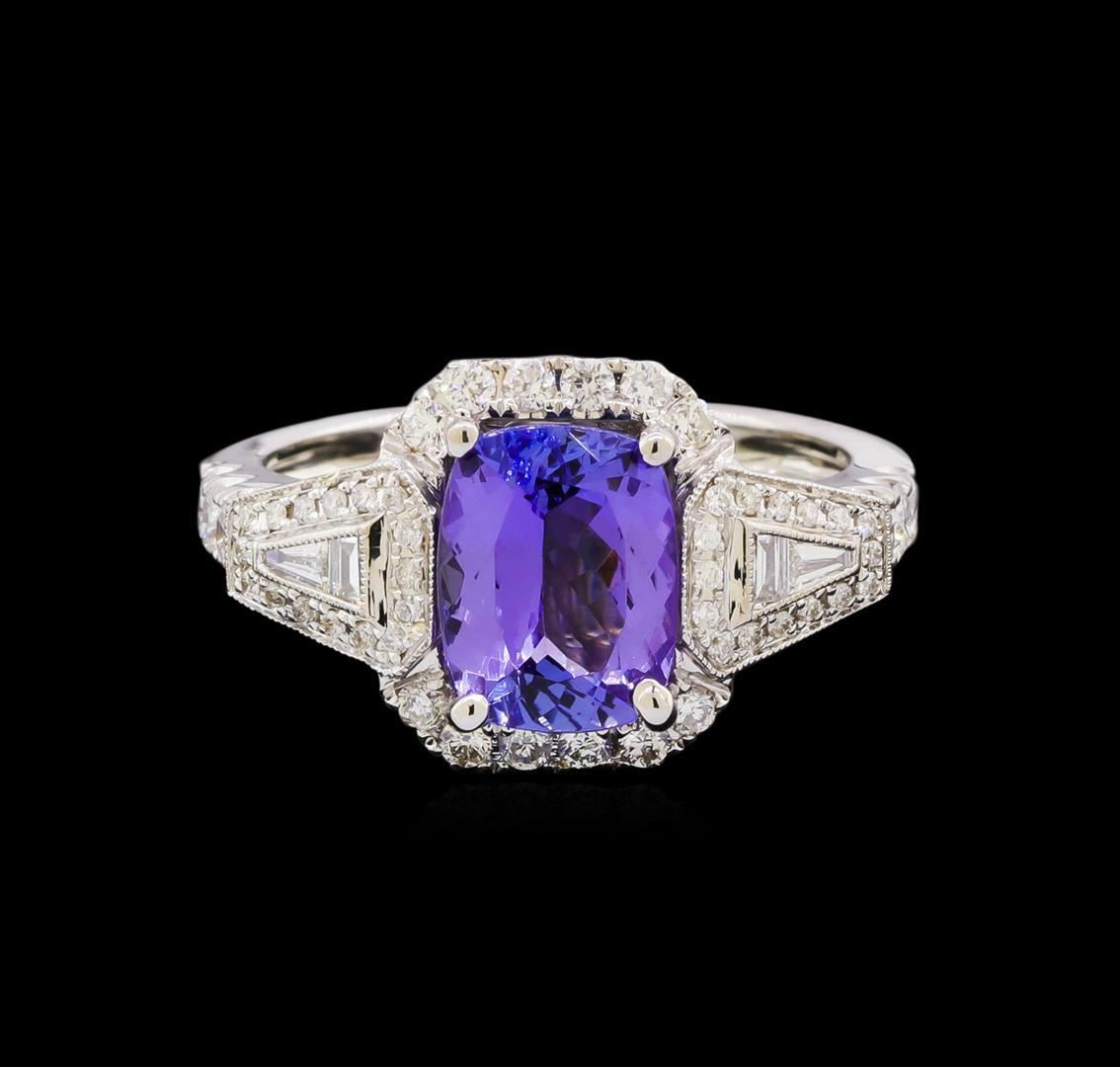 One electronically tested 14KT white gold ladies cast tanzanite & diamond ring with a bright finish. The featured tanzanite is set within a diamond bezel, supported by tapering diamond set shoulders, completed by a two millimeter wide band. Trademark is UCG. Identified with markings of "14K 585". Condition is good. Containing: One prong set rectangular cushion mixed cut natural tanzanite, measuring 8.80 x 6.80 x 4.00mm, 3% bulge factor, exact weight 1.94ct., clarity is eye clean, type I, medium dark, slightly grayish, bluish violet color, (GIA bV 6/2), cut is good. Transmitting light with no distortion, transparent. Graded in the setting. Tanzanite is a very rare gemstone that is only found in the country of Tanzania. Originally discovered in 1967. It is found in the Usumburu Mountains that border the Umba Valley of northern Tanzania. Tanzanite occurs in gray, brown, violet, blue, reddish-purple, & green. The gem is interesting because of its exceptional pleochroism. Rotated in different directions a tanzanite will exhibit multiple changes of color. Tanzanite has a low tolerance to ultrasonic cleaning, and should not be cleaned using this method. Four channel set baguette cut (tapered) diamonds, measuring from 2.30 x 1.30 x 0.88mm (depth est.) to 2.40 x 1.75 x 1.19mm (depth est.) approximate total weight of 4 Stones = 0.14ct. Graded in the setting. Clarity: VS-2 to SI-1. Color: G - H Eighteen prong set round brilliant cut diamonds, measuring 2.30 - 1.55 x 1.16mm (depth est.) approximate total weight of 18 Stones = 0.44ct. Graded in the setting. Clarity: SI-2 to I-1. Color: G - H Thirty-Two prong set round brilliant cut diamonds, measuring 0.90 - 0.80 x 0.51mm (depth est.) approximate total weight of 32 Stones = 0.08ct. Graded in the setting. Clarity: SI-2 to I-1. Color: G - I. Total Weight of Colored Stones 1.94ct. Total Weight of Diamonds 0.66ct. Total Weight of Ring 5.07 grams. AIG Appraised.