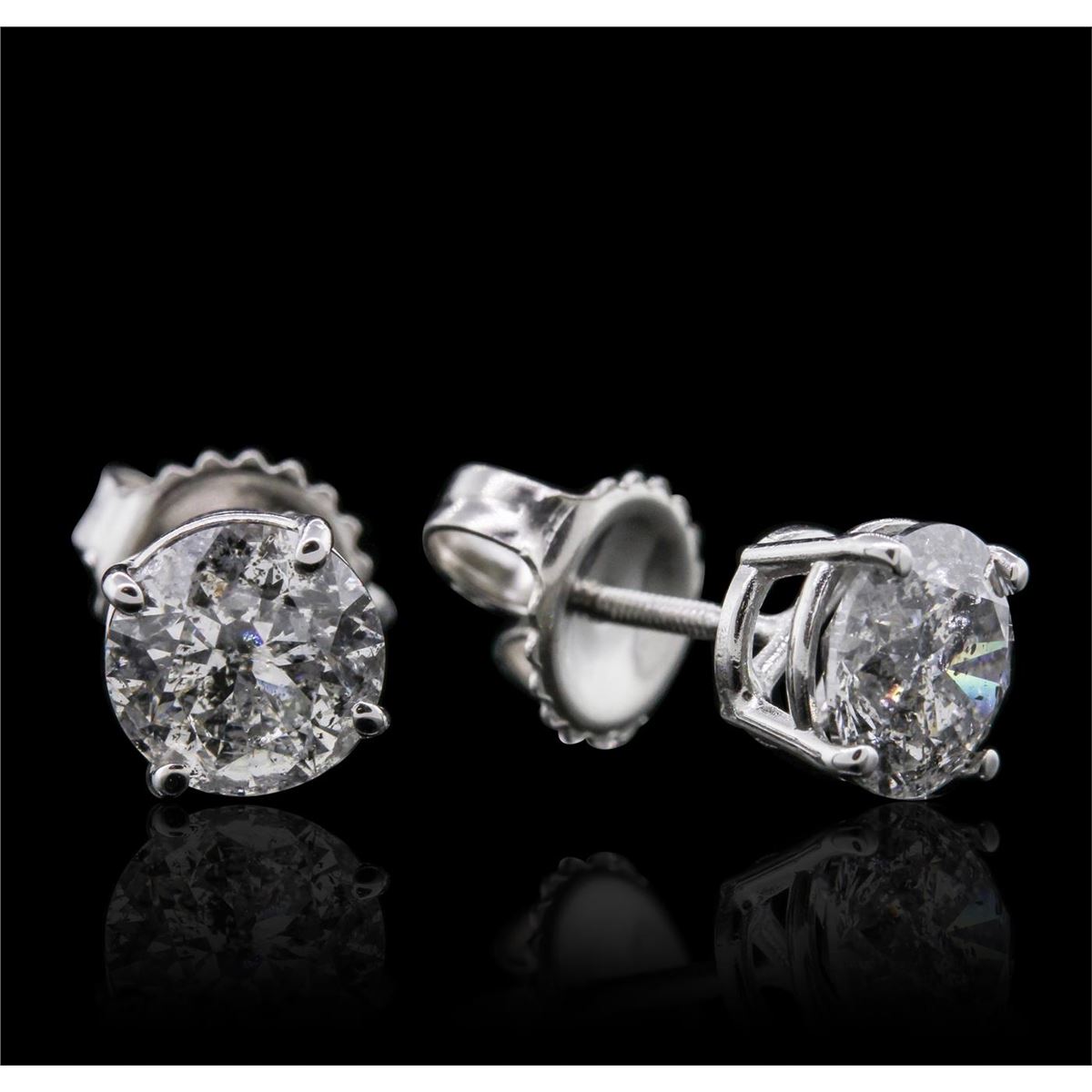 One pair electronically tested 14KT white gold cast & assembled diamond solitaire earrings with standard backs. Condition is new, good workmanship. Identified with markings of "14K". Containing: One prong set round brilliant cut diamond, measuring 6.27 - 6.20 x 3.90mm (depth est.), 3.00.%. GTCF approximate weight of 0.96ct. Graded in the setting. Clarity: I-2. Color: H Depth 62.6%. Table 56.2%. One prong set round brilliant cut diamond, measuring 6.26 - 6.25 x 4.00mm (depth est.), 4.00.%. GTCF approximate weight of 1.00ct with a faint blue fluorescence. Graded in the setting. Clarity: I-2. Color: I Depth 63.9%. Table 56.7%. Total Weight of Diamonds 1.96ct. Total Weight of Earrings 1.43 grams. AIG Appraised at $11,400.00.