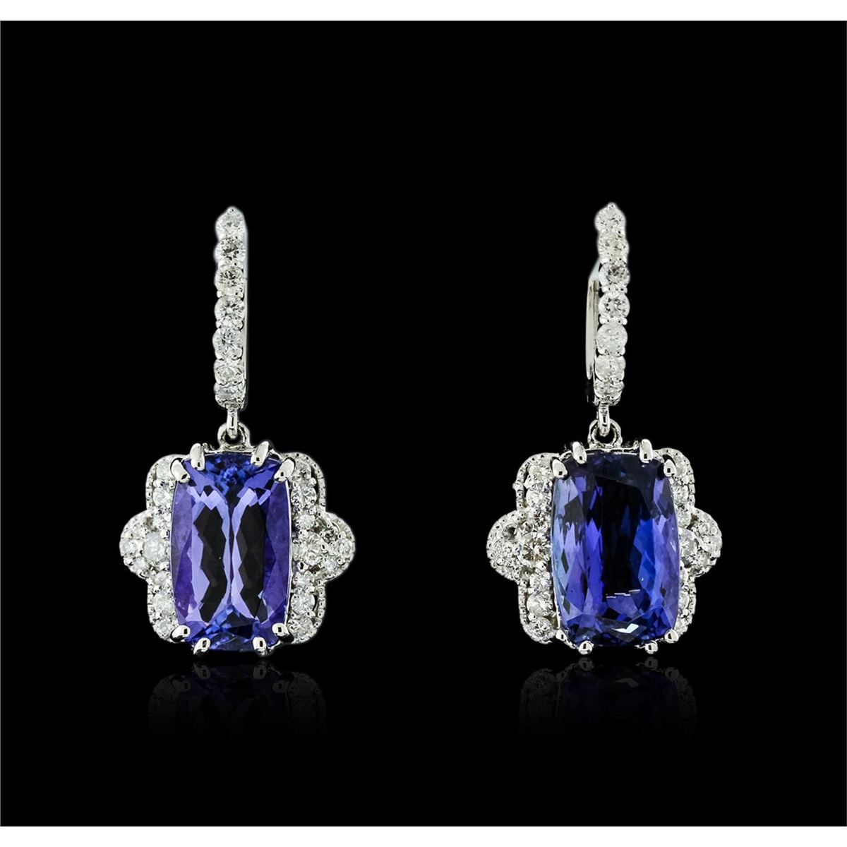 One pair electronically tested 14KT white gold ladies cast tanzanite and diamond earrings with hinged clip backs with a bright polish finish. Identified with markings of "14K". Condition is new. Containing: Two prong set rectangular cushion modified brilliant cut natural tanzanites, measuring 13.50 x 8.90 x 5.60mm, approximate total weight of 10.60ct., clarity is eye clean, type I, medium, very slightly grayish, violet color, (GIA V 5/3), cut is good. Sixty-Four prong set round brilliant cut diamonds, measuring 1.80 - 1.30 x 0.93mm (depth est.) approximate total weight of 64 Stones = 0.87ct. Clarity: SI-1 to I-1. Color: I - J, Cut is Good. Colored gemstones are presumed to have been subjected to commonly used enhancement processes. All diamonds and colored gemstones are graded in the mounting, unless otherwise stated. Total Weight of Colored Stones 10.60ct. Total Weight of Diamonds 0.87ct. Total Weight of Earrings 11.80 grams. GGL Appraised at $9,475.00.
