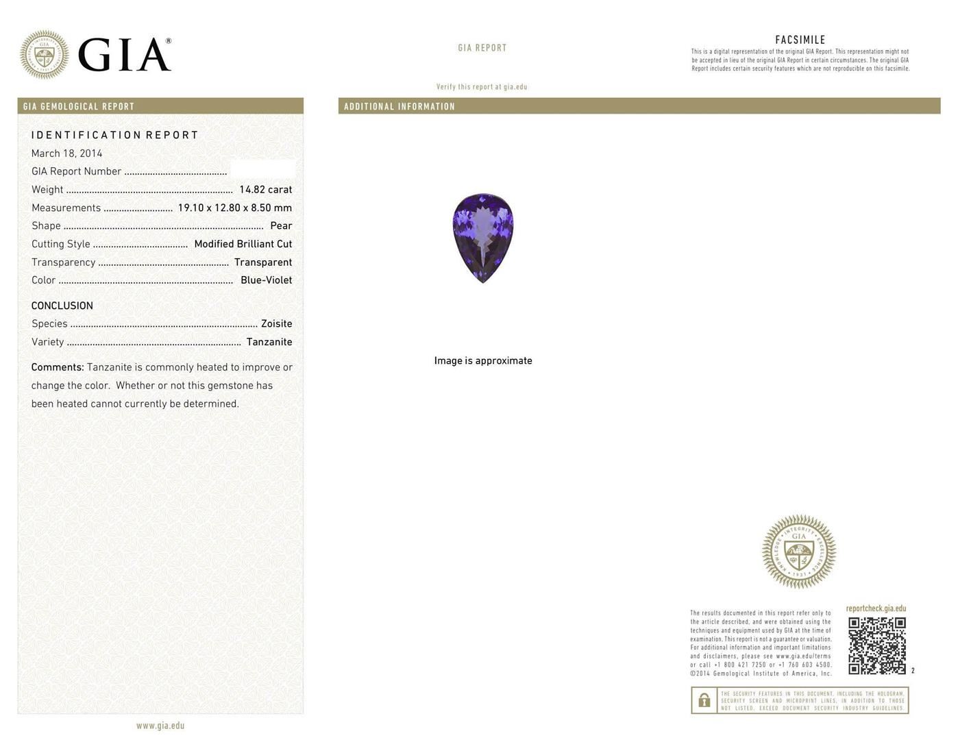 One electronically tested 14KT white gold Ladies combination cast & assembled fancy ring with a high polish finish. Condition is new. Identified with markings of "14K". Containing: One Hundred Fifty-Four prong set round brilliant cut diamonds, measuring 2.20 - 2.20 x 1.32mm (depth est.) approximate. Total Weight of 154 Stones = 5.37ct. Clarity: SI-2 to I-2. Color: H - I, Cut is Good. One prong set pear modified brilliant cut natural tanzanite, measuring 19.10 x 12.80 x 8.50mm, approximate weight of 14.82ct., clarity is eye clean, type I, medium, moderately strong, bluish violet color, (GIA bV 5/4), cut is very good. GIA Report: 2151964685.Total Weight of Colored Stones 14.82ct. Total Weight of Diamonds 5.37ct. Total Weight of Ring 16.10 grams. GGL Appraised.
