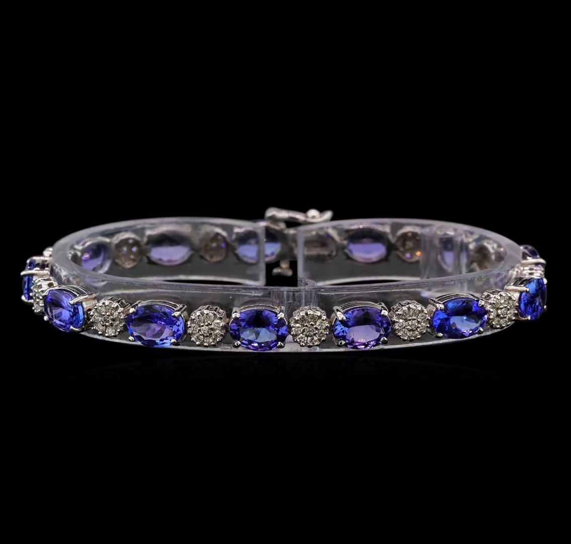 One electronically tested 14KT white gold ladies cast tanzanite and diamond bracelet with a hidden box clasp with safety closer with a bright polish finish. Measurements: 7" in length. Identified with markings of "14K". Condition is new. Containing: Thirteen prong set oval modified brilliant cut natural tanzanites, measuring 8.00. x 6.00. x 3.90mm, approximate total weight of 17.16ct., clarity is eye clean, type I, medium light, very slightly grayish, violet color, (GIA V 4/3), cut is good. One Hundred Four prong set round brilliant cut diamonds, measuring 1.30 - 1.30 x 0.78mm (depth est.) approximate total weight of 104 Stones = 0.83ct. Clarity: SI-2 to I-1. Color: I - J, Cut is Good. Colored gemstones are presumed to have been subjected to commonly used enhancement processes. All diamonds and colored gemstones are graded in the mounting, unless otherwise stated. Total Weight of Colored Stones 17.16ct. Total Weight of Diamonds 0.83ct. Total Weight of Bracelet 15.00 grams. GGL Appraised.