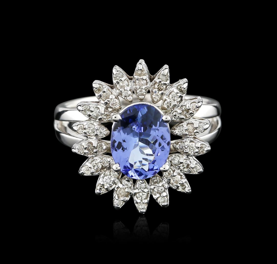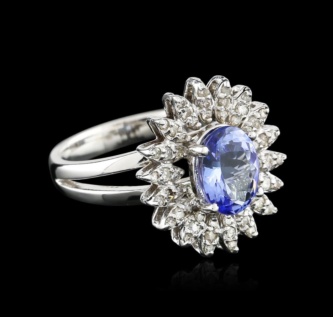 One electronically tested 14KT white gold ladies cast tanzanite and diamond ring with a split shoulder shank with a bright polish finish. Identified with markings of "K14". Condition is new. Containing: One prong set oval modified brilliant cut natural ta GGL Appraised at $3,105.00.