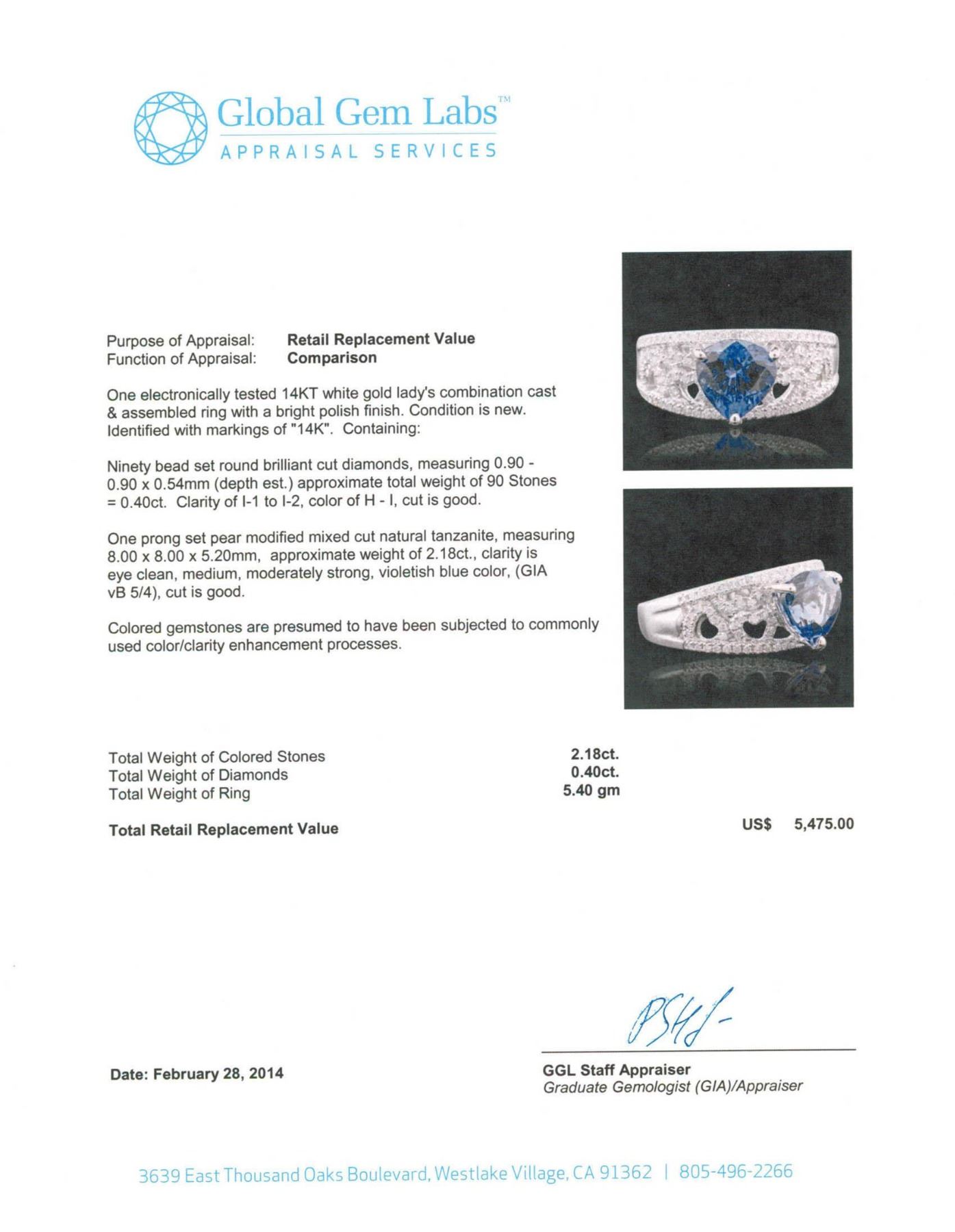 One electronically tested 14KT white gold Ladies combination cast & assembled ring with a bright polish finish. Condition is new. Identified with markings of "14K". Containing: Ninety bead set round brilliant cut diamonds, measuring 0.90 - 0.90 x 0.54mm (depth est.) approximate. Total Weight of 90 Stones = 0.40 ct. Clarity: I-1 to I-2. Color: H - I, Cut is Good. One prong set pear modified mixed cut natural tanzanite, measuring 8.00 x 8.00 x 5.20mm, approximate weight of 2.18ct., clarity is eye clean, medium, moderately strong, violetish blue color, (GIA vB 5/4), cut is good. Colored gemstones are presumed to have been subjected to commonly used color/clarity enhancement processes. Total Weight of Colored Stones 2.18ct. Total Weight of Diamonds 0.40 ct. Total Weight of Ring 5.40 grams. GGL Appraised.