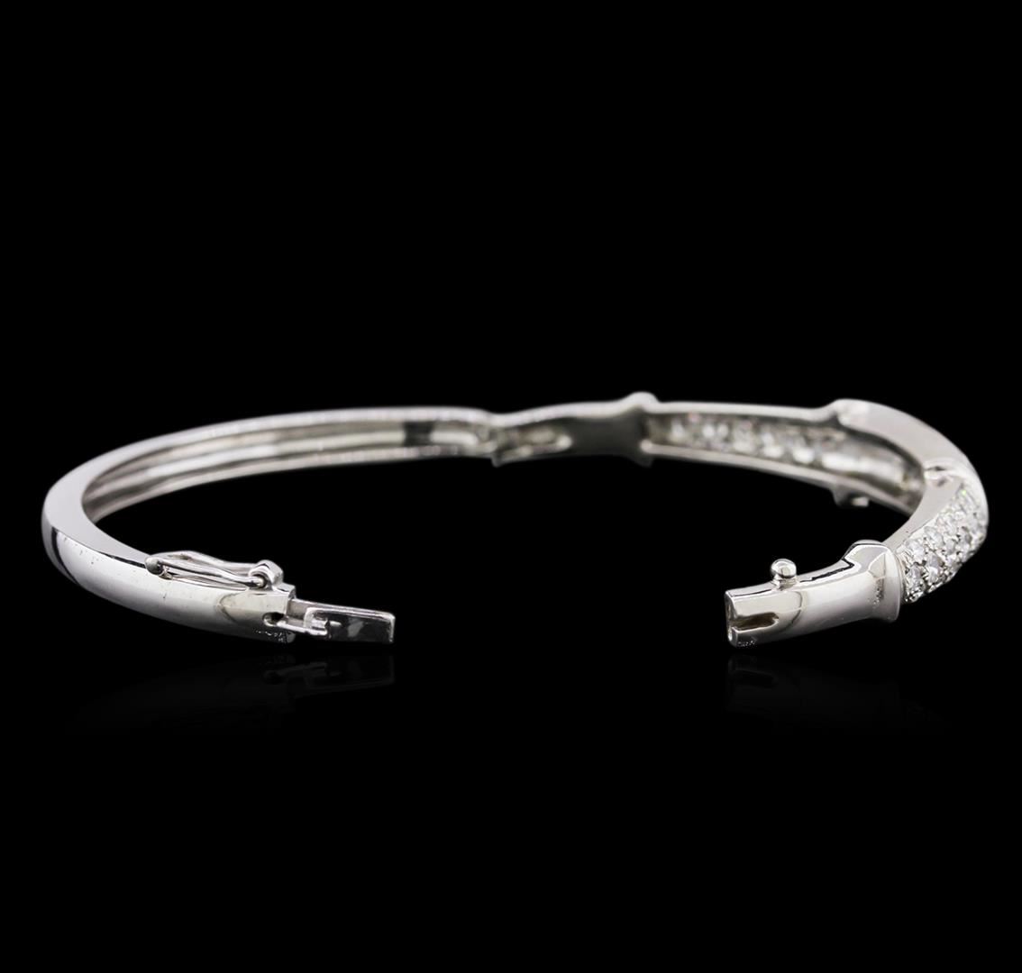 One electronically tested 14KT white gold ladies cast diamond bangle bracelet with a hidden box clasp with safety closer with a bright polish finish. Identified with markings of "14K". Condition is new. Containing: Fifty-One prong set round brilliant cut diamonds, measuring 2.50 - 1.80 x 1.29mm (depth est.) approximate total weight of 51 Stones = 2.30 ct. Clarity: VS-2 to SI-1. Color: H - I, Cut is Good. Diamonds are graded in the mounting, unless otherwise stated. Total Weight of Diamonds 2.30 ct. Total Weight of Bangle Bracelet 20.60 grams. GGL Appraised.