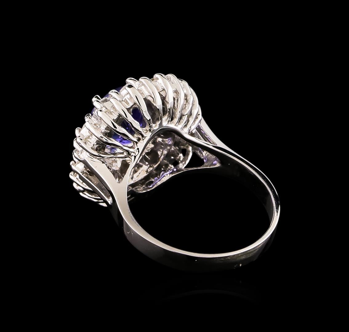 One electronically tested 14KT white gold Ladies cast ring with a bright polish finish. Condition is new. Identified with markings of "14K". Containing: One prong set oval modified brilliant cut natural tanzanite, measuring 9.10 x 7.50 x 5.15mm, approximate weight of 2.38ct., clarity is eye clean, type I, medium, moderately strong, violet color, (GIA V 5/4), cut is good. Colored gemstones are presumed to have been subjected to commonly used color/clarity enhancement processes. Twenty-Six prong set round brilliant cut diamonds, measuring 1.90 - 1.90 x 1.14mm (depth est.) approximate. Total Weight of 26 Stones = 0.65ct. Clarity: I-1 to I-2. Color: H - I, Cut is Good. All grading of diamonds and colored gemstones in this piece of jewelry are graded in the mounting, unless otherwise stated. Ten prong set round brilliant cut diamonds, measuring 2.90 - 2.90 x 1.74mm (depth est.) approximate. Total Weight of 10 Stones = 0.89ct. Clarity: SI-2 to I-1. Color: I - J, Cut is Good. All grading of diamonds and colored gemstones in this piece of jewelry are graded in the mounting, unless otherwise stated. Total Weight of Colored Stones 2.38ct. Total Weight of Diamonds 1.55ct. Total Weight of Ring 8.40 grams. GGL Appraised.
