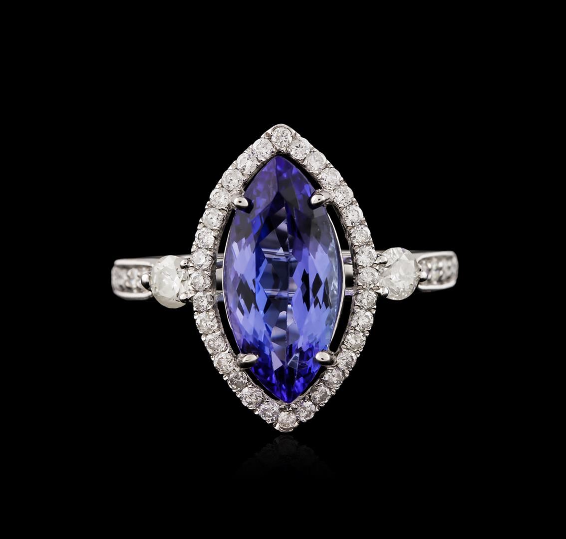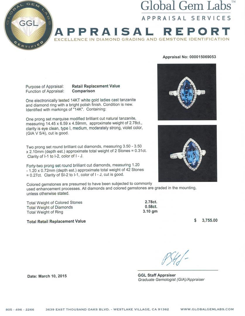 One electronically tested 14KT white gold ladies cast tanzanite and diamond ring with a bright polish finish. Identified with markings of "14K". Condition is new. Containing: One prong set marquise modified brilliant cut natural tanzanite, measuring 14.45 x 6.59 x 4.59mm, approximate weight of 2.78ct., clarity is eye clean, type I, medium, moderately strong, violet color, (GIA V 5/4), cut is good. Two prong set round brilliant cut diamonds, measuring 3.50 - 3.50 x 2.10mm (depth est.) approximate total weight of 2 Stones = 0.31ct. Clarity: I-1 to I-2. Color: I - J. Forty-Two prong set round brilliant cut diamonds, measuring 1.20 - 1.20 x 0.72mm (depth est.) approximate total weight of 42 Stones = 0.27ct. Clarity: SI-2 to I-1. Color: I - J, Cut is Good. Colored gemstones are presumed to have been subjected to commonly used enhancement processes. All diamonds and colored gemstones are graded in the mounting, unless otherwise stated. Total Weight of Colored Stones 2.78ct. Total Weight of Diamonds 0.58ct. Total Weight of Ring 3.10 grams. GGL Appraised at $3,755.00.