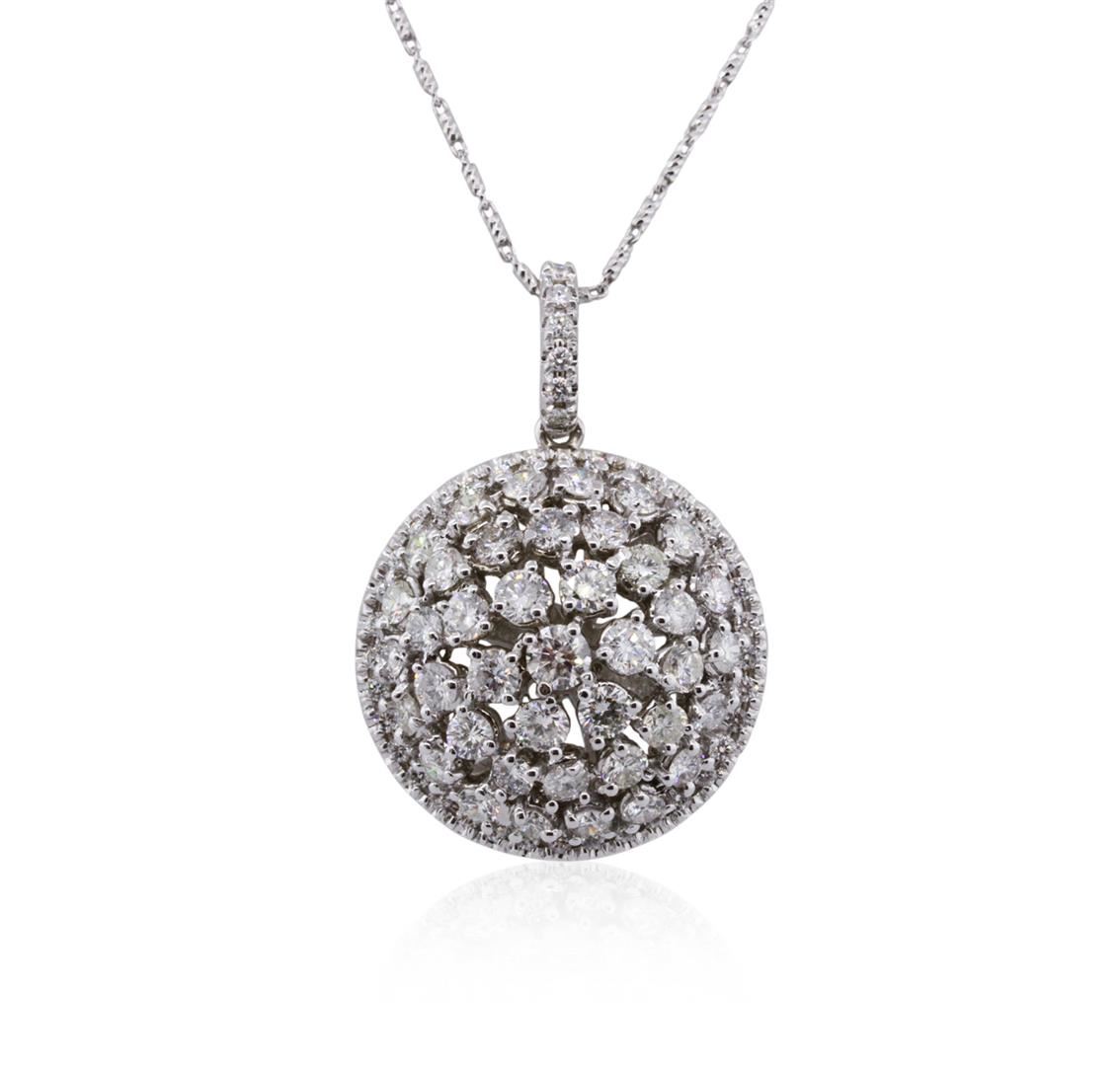 One electronically tested 14KT white gold ladies combination cast & assembled diamond pendant & chain 18.0" long, medium cable link with a lobster claw clasp with a bright polish finish. Identified with markings of "K14". Condition is new. Containing: Forty-Three prong set round brilliant cut diamonds, measuring 1.30 - 1.30 x 0.78mm (depth est.) approximate total weight of 43 Stones = 0.34ct. Clarity: I-1. Color: I - J, Cut is Good. Forty prong set round brilliant cut diamonds, measuring 3.50 - 2.50 x 1.80mm (depth est.) approximate total weight of 40 Stones = 2.50 ct. Clarity: SI-1 to I-1. Color: I - J, Cut is Good. All diamonds are graded in the mounting, unless otherwise stated. Total Weight of Diamonds 2.84ct. Total Weight of Pendant & Chain 15.10 grams. GGL Appraised.