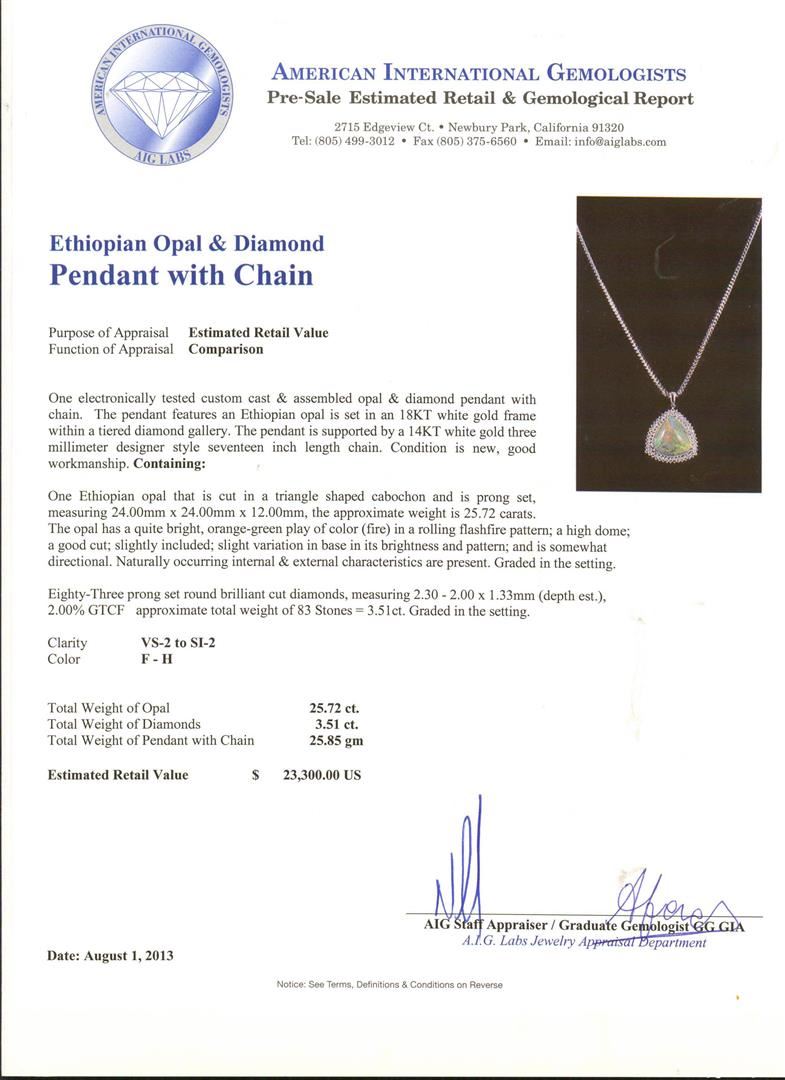 One electronically tested custom cast & assembled opal & diamond pendant with chain. The pendant features an Ethiopian opal is set in an 18KT white gold frame within a tiered diamond gallery. The pendant is supported by a 14KT white gold three millimeter designer style seventeen inch length chain. Condition is new, good workmanship. Containing: One Ethiopian opal that is cut in a triangle shaped cabochon and is prong set, measuring 24.00mm x 24.00mm x 12.00mm, the approximate weight is 25.72 carats. The opal has a quite bright, orange-green play of color (fire) in a rolling flash fire pattern; a high dome; a good cut; slightly included; slight variation in base in its brightness and pattern; and is somewhat directional. Naturally occurring internal & external characteristics are present. Graded in the setting. Eighty-Three prong set round brilliant cut diamonds, measuring 2.30 - 2.00 x 1.33mm (depth est.), 2.00% GTCF approximate total weight of 83 Stones = 3.51ct. Graded in the setting. Clarity VS-2 to SI-2. Color F -- H. Total Weight of Opal 25.72 ct. Total Weight of Diamonds 3.51 ct. Total Weight of Pendant with Chain 25.85gm. AIG Appraised.