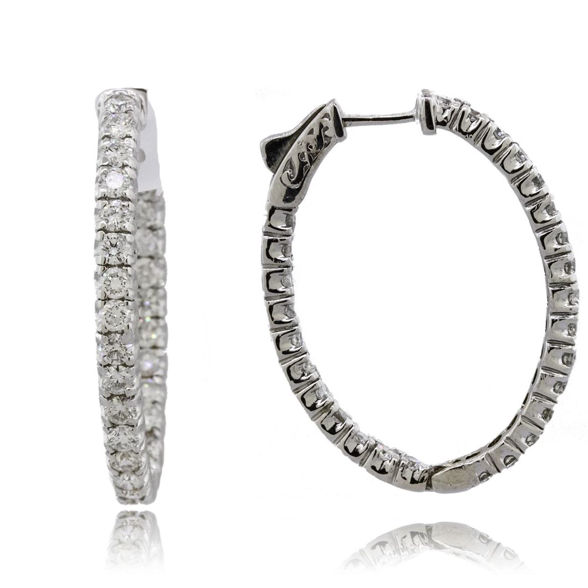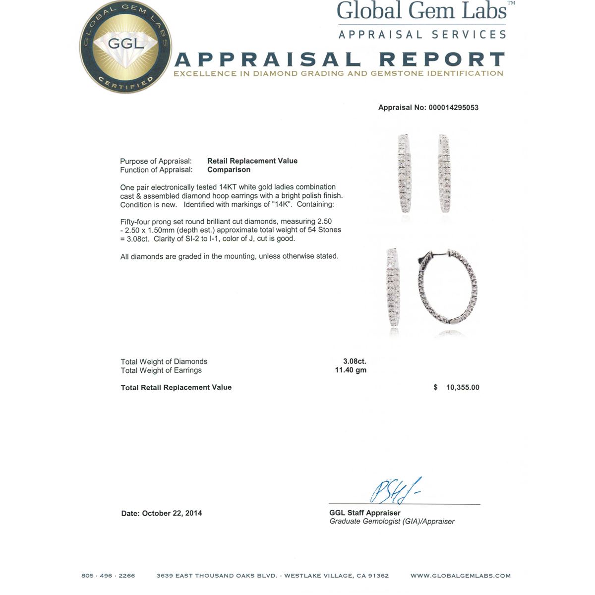 One pair electronically tested 14KT white gold ladies combination cast & assembled diamond hoop earrings with a bright polish finish. Identified with markings of "14K". Condition is new. Containing: Fifty-Four prong set round brilliant cut diamonds, measuring 2.50 - 2.50 x 1.50mm (depth est.) approximate total weight of 54 Stones = 3.08ct. Clarity: SI-2 to I-1. Color: J, Cut is Good. All diamonds are graded in the mounting, unless otherwise stated. Total Weight of Diamonds 3.08ct. Total Weight of Earrings 11.40 grams. GGL Appraised at $10,355.00.