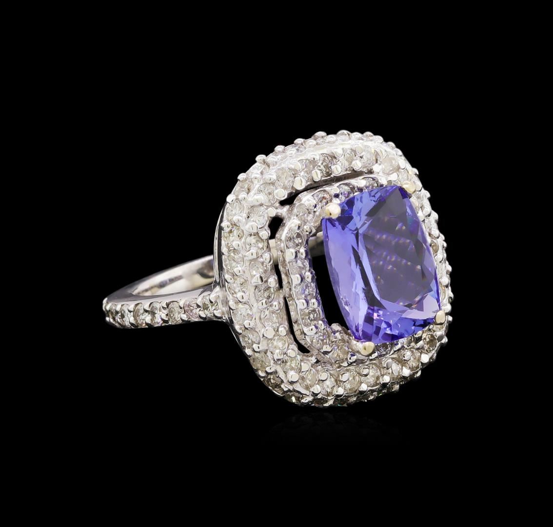 One electronically tested 14KT white gold ladies combination cast & assembled tanzanite and diamond ring with a flat shank with a bright polish finish. Identified with markings of "14K". Condition is new. Containing: One prong set rectangular cushion modified brilliant cut natural tanzanite, measuring 10.40 x 8.16 x 4.76mm, approximate weight of 3.18ct., clarity is eye clean, type I, medium light, very slightly grayish, violet color, (GIA V 4/3), cut is good. One Hundred Three prong set round brilliant cut diamonds, measuring 1.70 - 1.20 x 0.87mm (depth est.) approximate total weight of 103 Stones = 1.14ct. Clarity: I-1 to I-2. Color: I - J, Cut is Good. Colored gemstones are presumed to have been subjected to commonly used enhancement processes. All diamonds and colored gemstones are graded in the mounting, unless otherwise stated. Total Weight of Colored Stones 3.18ct. Total Weight of Diamonds 1.14ct. Total Weight of Ring 9.60 grams. GGL Appraised.