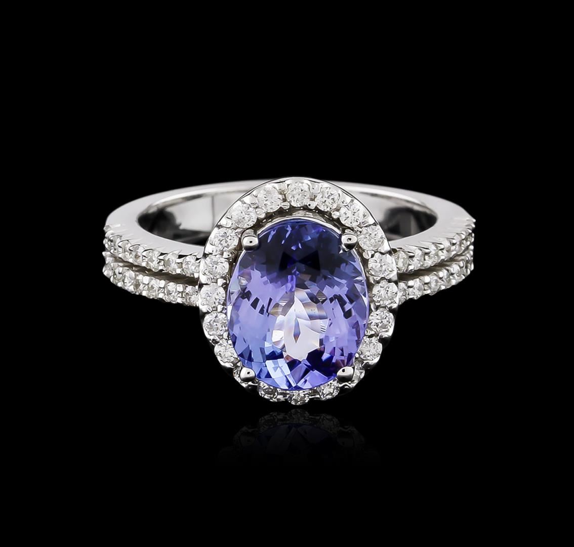 One electronically tested 14KT white gold ladies cast tanzanite and diamond ring with a split shoulder shank with a bright polish finish. Identified with markings of "K14". Condition is new. Containing: One prong set oval modified brilliant cut natural tanzanite, measuring 9.70 x 8.70 x 5.66mm, approximate weight of 3.36ct., clarity is eye clean, type I, medium light, very slightly grayish, violet color, (GIA V 4/3), cut is good. Fifty-Two prong set round brilliant cut diamonds, measuring 1.50 - 1.30 x 0.84mm (depth est.) approximate total weight of 52 Stones = 0.52ct. Clarity of SI-1 to I-1, Color of I - J. All diamonds and colored gemstones are graded in the mounting, unless otherwise stated. Colored gemstones are presumed to have been subjected to commonly used enhancement processes. Total Weight of Colored Stones 3.36ct. Total Weight of Diamonds 0.52ct. Total Weight of Ring 5.40 grams. GGL Appraised at $4,690.00.