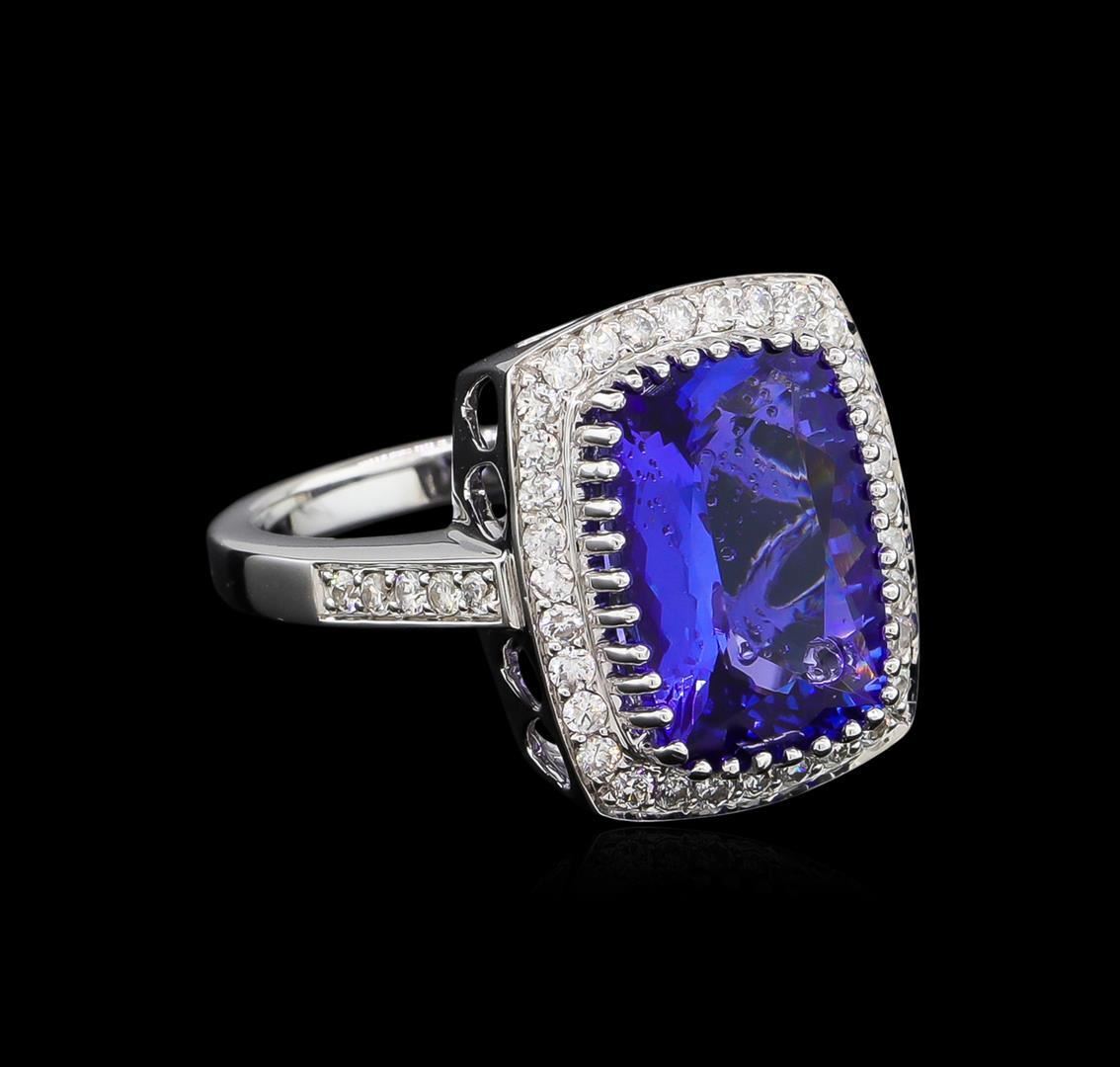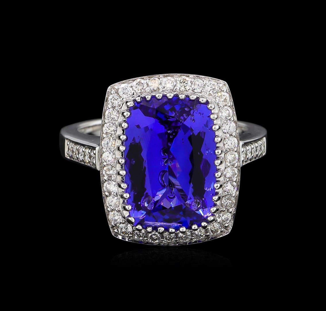 One electronically tested 14KT white gold Ladies combination cast & assembled ring with a bright polish finish. Condition is new. Identified with markings of "14K". Containing: One prong set rectangular cushion modified brilliant cut natural tanzanite, measuring 14.00 x 10.00 x 5.40mm, approximate weight of 5.95ct., clarity is eye clean, type I, medium dark, moderately strong, bluish violet color, (GIA bV 6/4), cut is very good. Colored gemstones are presumed to have been subjected to commonly used color/clarity enhancement processes. Forty-Two prong set round brilliant cut diamonds, measuring 1.50 - 1.50 x 0.90mm (depth est.) approximate. Total Weight of 42 Stones = 0.52ct. Clarity: SI-2 to I-1. Color: G - H, Cut is Good. Total Weight of Colored Stones 5.95ct. Total Weight of Diamonds 0.52ct. Total Weight of Ring 8.20 grams. GGL Appraised.