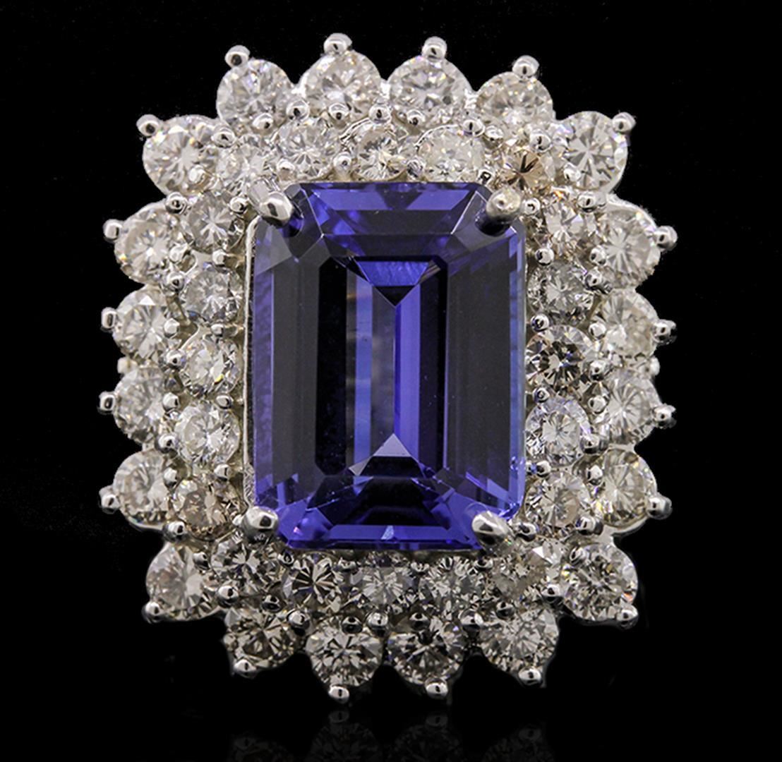 One electronically tested 14KT white gold Ladies combination cast & assembled ring with a bright polish finish. Condition is new. Identified with markings of "K14". Containing: One prong set emerald standard step cut natural tanzanite, measuring 12.79 x 9.43 x 6.35mm, approximate weight of 6.93ct., clarity is eye clean, type I, medium light, moderately strong, bluish violet color, (GIA bV 4/4), cut is very good. Colored gemstones are presumed to have been subjected to commonly used color/clarity enhancement processes. Twenty prong set round brilliant cut diamonds, measuring 2.80 - 2.80 x 1.68mm (depth est.) approximate. Total Weight of 20 Stones = 1.61ct. Clarity: SI-2 to I-1. Color: J - K, Cut is Good. Twenty prong set round brilliant cut diamonds, measuring 2.10 - 2.10 x 1.26mm (depth est.) approximate. Total Weight of 20 Stones = 0.68ct. Clarity: I-1 to I-2. Color: J - K, Cut is Good. Total Weight of Colored Stones 6.93ct. Total Weight of Diamonds 2.28ct. Total Weight of Ring 10.90 grams. GGL Appraised.