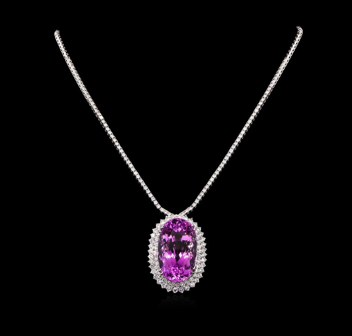 One polished, stamped, and electronically tested solid 14KT White Gold necklace mounted with: 1 genuine kunzite weighing 71.43 carats and 160 genuine round diamonds weighing 8.39 carats. The necklace measures 17 inches in length and is finnished with a tension lock clasp and safety clasp. This item weighs 46.2 grams, condition is new, excellent workmanship. AIGL Appraised.
