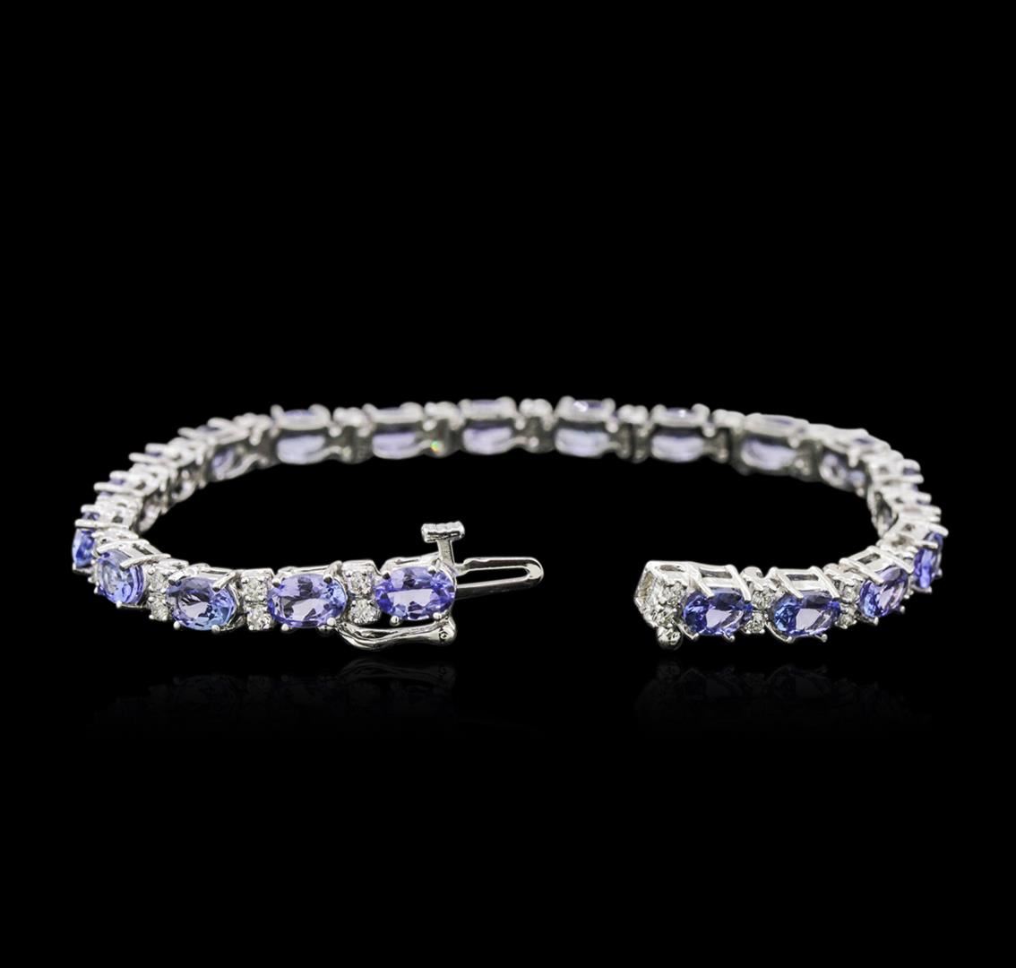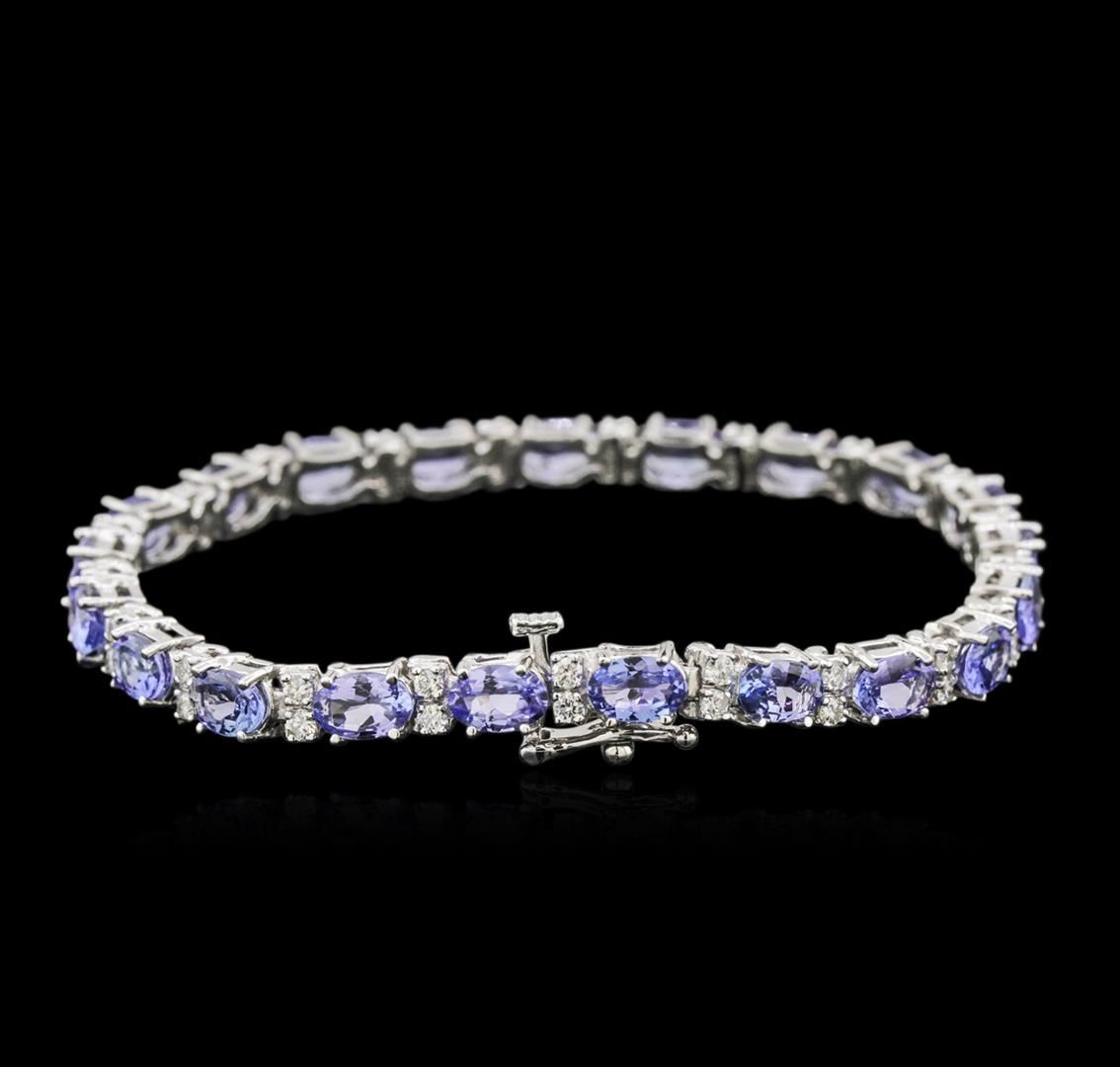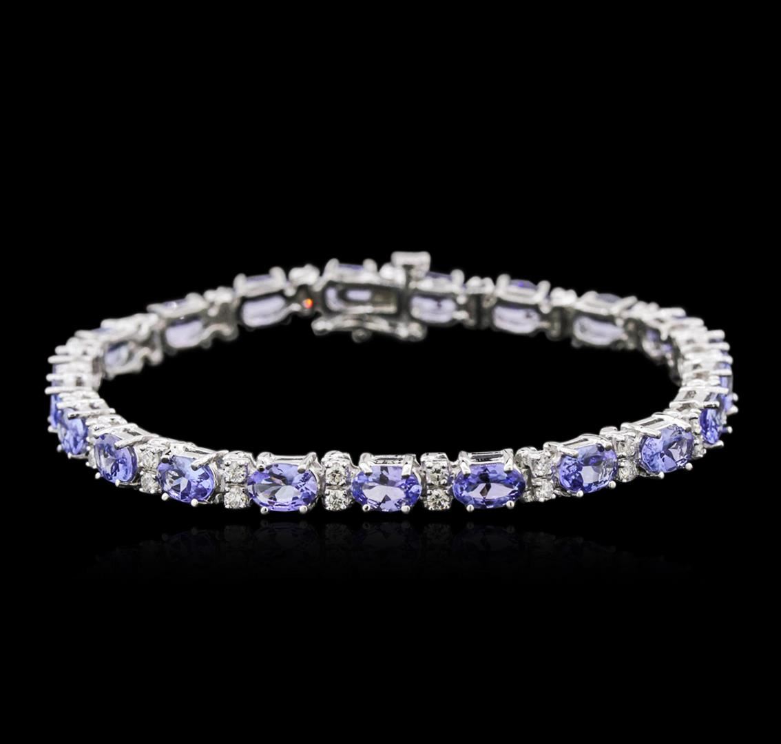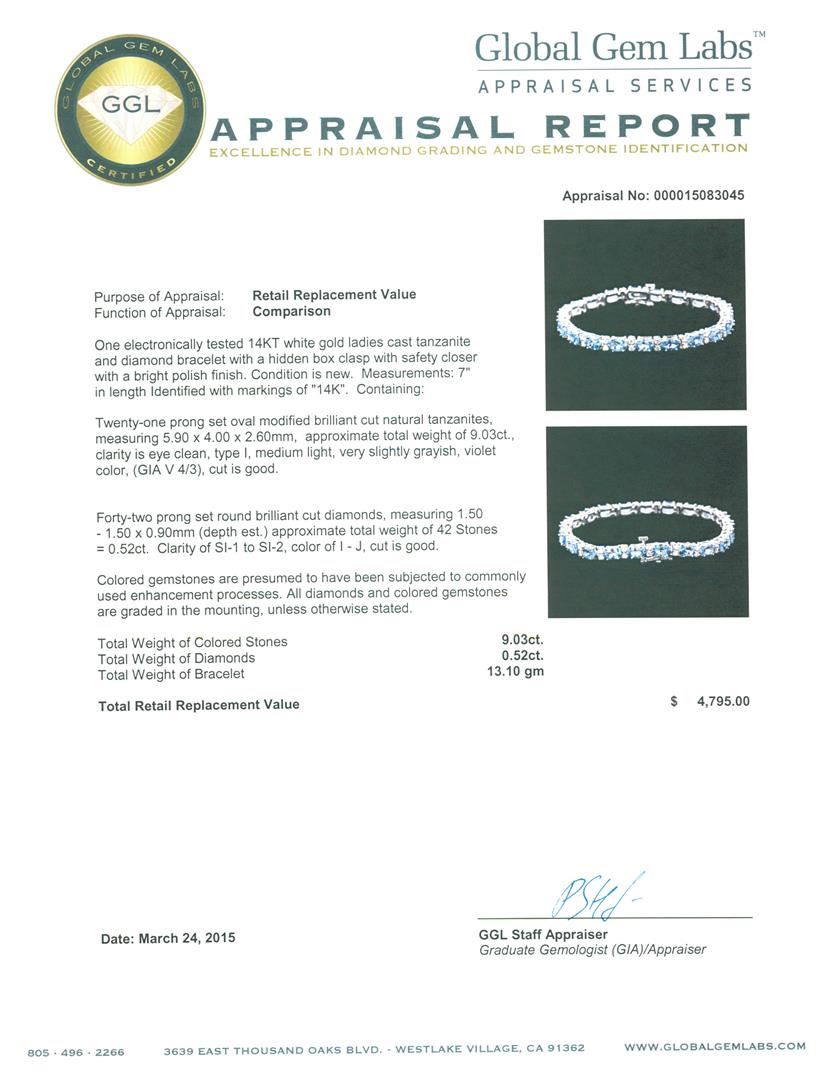 One electronically tested 14KT white gold ladies cast tanzanite and diamond bracelet with a hidden box clasp with safety closer with a bright polish finish. Measurements: 7" in length Identified with markings of "14K". Condition is new. Containing: Twenty-one prong set oval modified brilliant cut natural tanzanites, measuring 5.90 x 4.00 x 2.60mm, approximate total weight of 9.03ct., clarity is eye clean, type I, medium light, very slightly grayish, violet color, (GIA V 4/3), cut is good. Forty-Two prong set round brilliant cut diamonds, measuring 1.50 - 1.50 x 0.90mm (depth est.) approximate total weight of 42 Stones = 0.52ct. Clarity: SI-1 to SI-2. Color: I - J, Cut is Good. Colored gemstones are presumed to have been subjected to commonly used enhancement processes. All diamonds and colored gemstones are graded in the mounting, unless otherwise stated. Total Weight of Colored Stones 9.03ct. Total Weight of Diamonds 0.52ct. Total Weight of Bracelet 13.10 grams. GGL Appraised at $4,795.00.