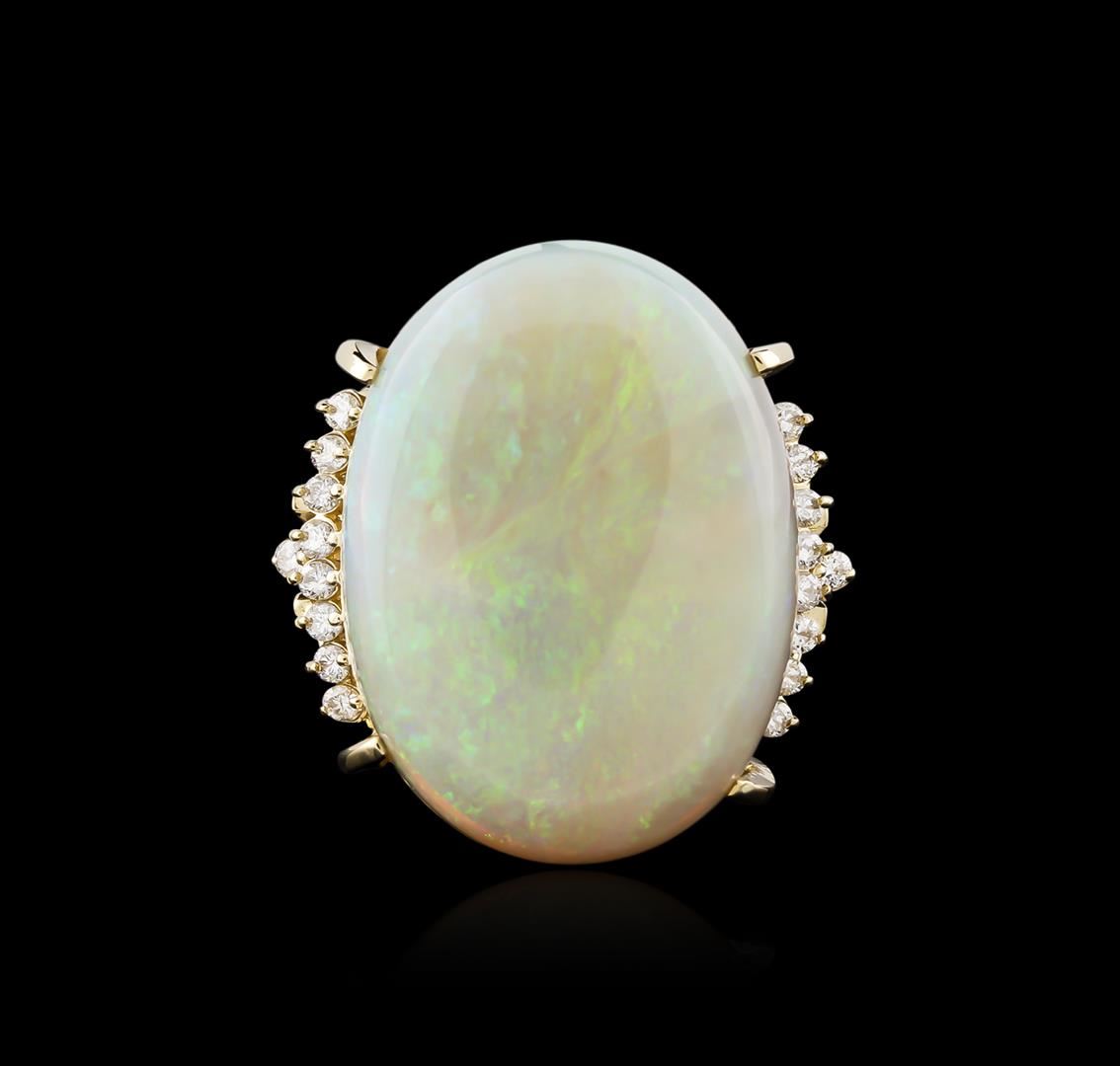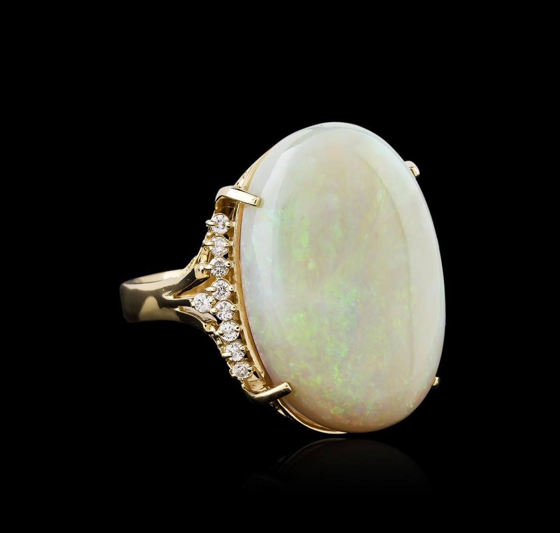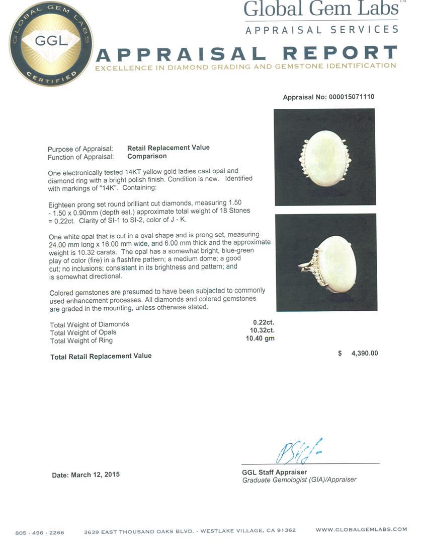 One electronically tested 14KT yellow gold ladies cast opal and diamond ring with a bright polish finish. Identified with markings of "14K". Condition is new. Containing: Eighteen prong set round brilliant cut diamonds, measuring 1.50 - 1.50 x 0.90mm (depth est.) approximate total weight of 18 Stones = 0.22ct. Clarity: SI-1 to SI-2. Color: J - K. One white opal that is cut in a oval shape and is prong set, measuring 24.00. mm long x 16.00. mm wide, and 6.00. mm thick and the approximate weight is 10.32 carats. The opal has a somewhat bright, blue-green play of color (fire) in a flashfire pattern; a medium dome; a good cut; no inclusions; consistent in its brightness and pattern; and is somewhat directional. Colored gemstones are presumed to have been subjected to commonly used enhancement processes. All diamonds and colored gemstones are graded in the mounting, unless otherwise stated. Total Weight of Diamonds 0.22ct. Total Weight of Opals 10.32ct. Total Weight of Ring 10.40 grams. GGL Appraised at $4,390.00.