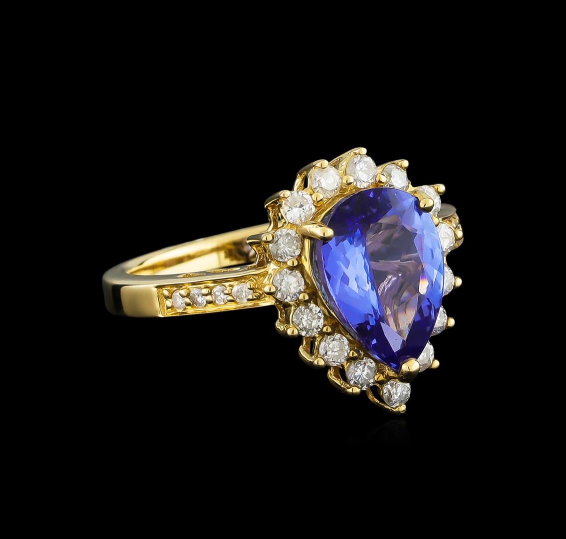 One electronically tested 14KT yellow gold ladies combination cast & assembled tanzanite and diamond ring with a flat shank with a bright polish finish. Identified with markings of "14K". Condition is new. Containing: One prong set pear modified brilliant cut natural tanzanite, measuring 10.50 x 7.91 x 5.14mm, approximate weight of 2.86ct., clarity is eye clean, type I, medium, very slightly grayish, violet color, (GIA V 5/3), cut is good. Fifteen prong set round brilliant cut diamonds, measuring 1.80 - 1.80 x 1.08mm (depth est.) approximate total weight of 15 Stones = 0.32ct. Clarity: I-1 to I-2. Color: J, Cut is Good. Eight prong set round brilliant cut diamonds, measuring 1.00 - 1.00 x 0.60mm (depth est.) approximate total weight of 8 Stones = 0.03ct. Clarity: I-1 to I-2. Color: J, Cut is Good. Colored gemstones are presumed to have been subjected to commonly used enhancement processes. All diamonds and colored gemstones are graded in the mounting, unless otherwise stated. Total Weight of Colored Stones 2.86ct. Total Weight of Diamonds 0.35ct. Total Weight of Ring 5.70 grams. GGL Appraised.