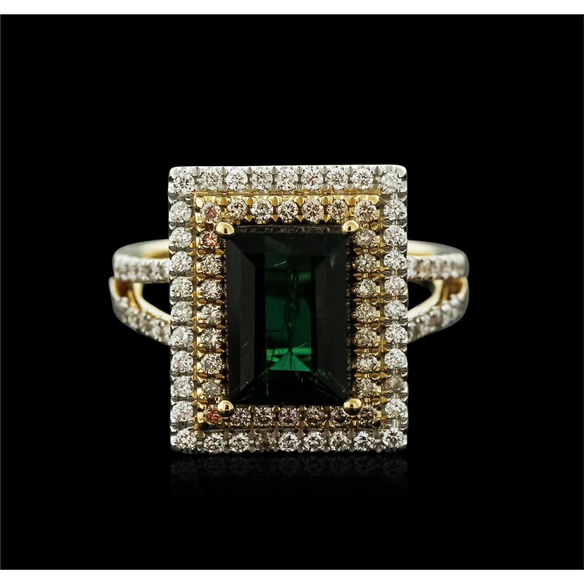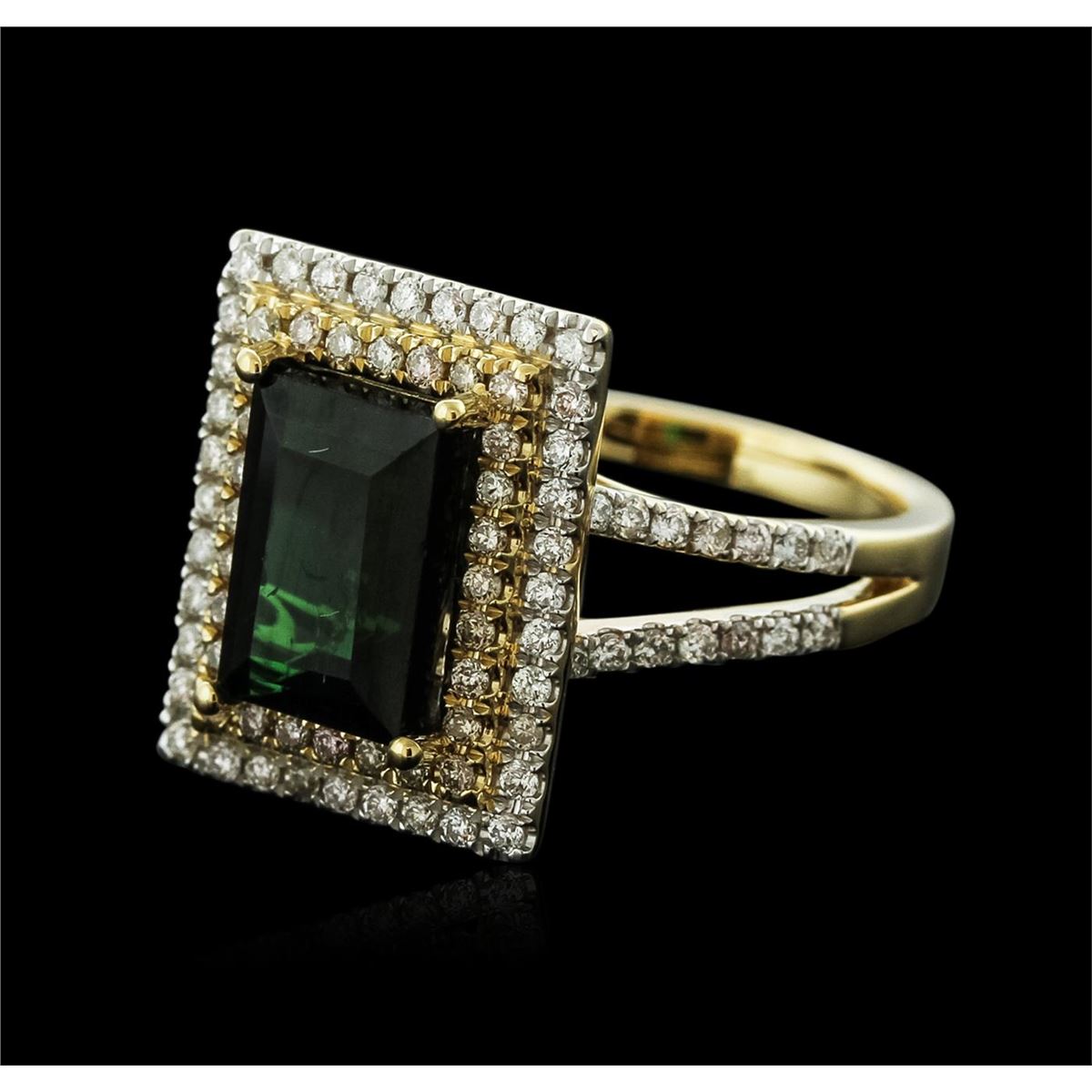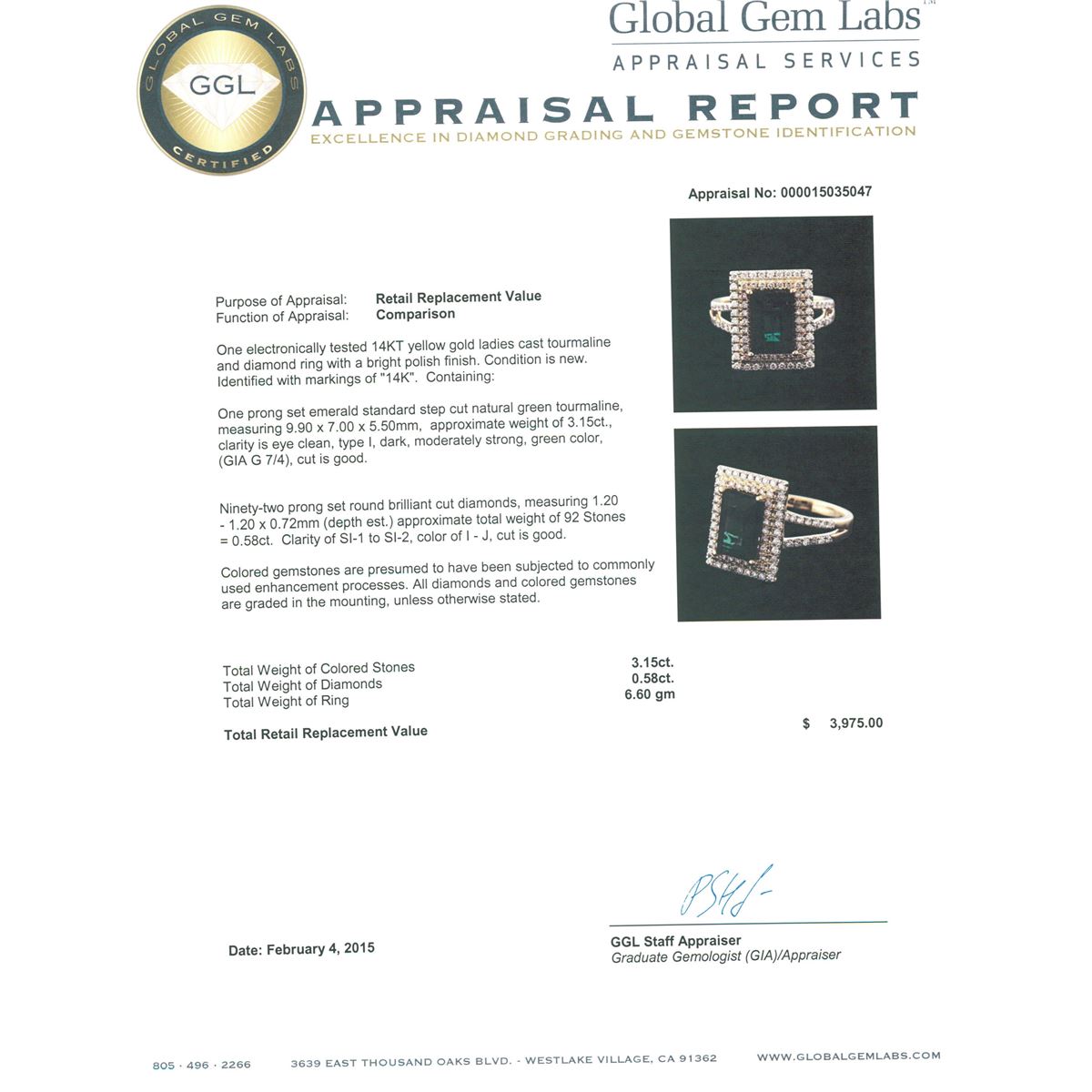 One electronically tested 14KT yellow gold ladies cast tourmaline and diamond ring with a bright polish finish. Identified with markings of "14K". Condition is new. Containing: One prong set emerald standard step cut natural green tourmaline, measuring 9.90 x 7.00 x 5.50mm, approximate weight of 3.15ct., clarity is eye clean, type I, dark, moderately strong, green color, (GIA G 7/4), cut is good. Ninety-Two prong set round brilliant cut diamonds, measuring 1.20 - 1.20 x 0.72mm (depth est.) approximate total weight of 92 Stones = 0.58ct. Clarity: SI-1 to SI-2. Color: I - J, Cut is Good. Colored gemstones are presumed to have been subjected to commonly used enhancement processes. All diamonds and colored gemstones are graded in the mounting, unless otherwise stated. Total Weight of Colored Stones 3.15ct. Total Weight of Diamonds 0.58ct. Total Weight of Ring 6.60 grams. GGL Appraised at $3,975.00.