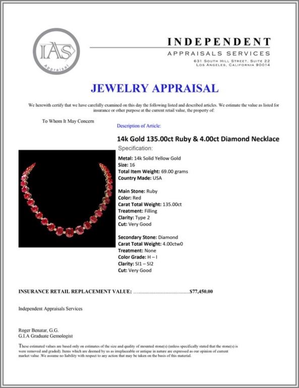 Regarding Appraised Jewelry and Loose Stones - Auctionfarm sends them out to a third party for Retail Replacement Value Appraisals, which are the most common. These types of evaluations are written for insurance needs. This would be the cost to replace the jewelry with an item of equal quality and kind, considered to be the current market price or the replacement value. This type of appraisal is done to protect you in the event of damage or loss of a valuable item. Our appraisals are conducted by independent 3rd Party appraisal firms that utilizes Certified GIA Gemologist. Appraisals should be used for verification of gemstone and/or metal weight, size, and grade only, not actual value. Appraisal value should be considered for insurance purposes only, not actual value, as price varies greatly from retail locations thru out the world. Items should not be purchased with the expectation to resell for appraisal price, or for profit.