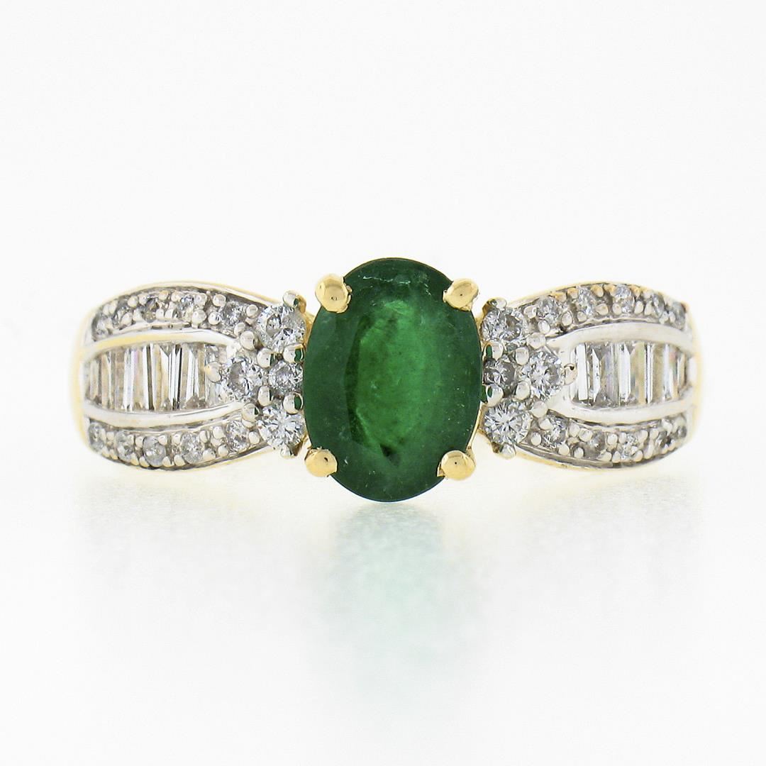 A solid 14k yellow & white gold ring, with 1 oval cut natural emerald (8.06x5.93mm - 1.26ct ), and 28 round brilliant cut natural diamonds (H/I - I1/I2 ; 0.30ctw), and 12 baguette cut natural diamonds (H/I - SI2/I1 ; 0.30ctw). The ring is size 9.0, weighs a total of 3.32 grams, and measures 8.1mm wide.