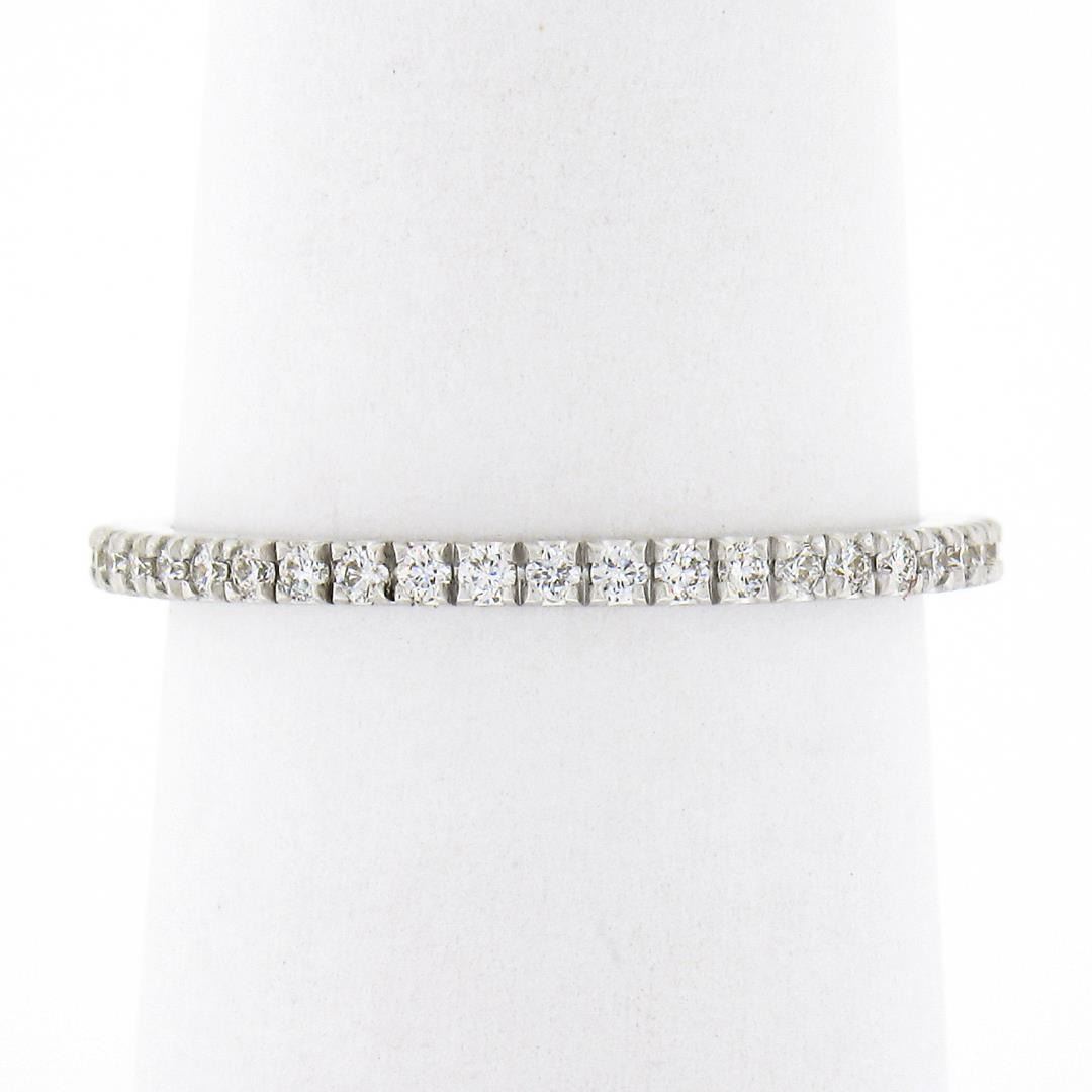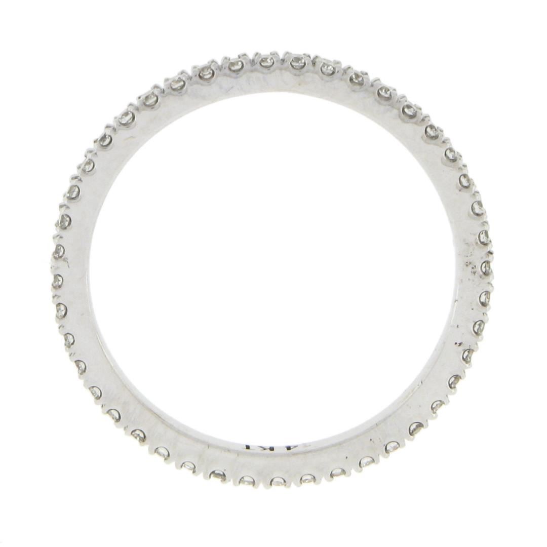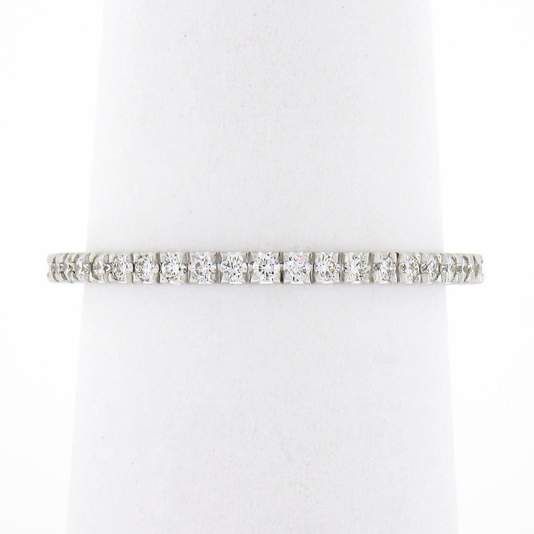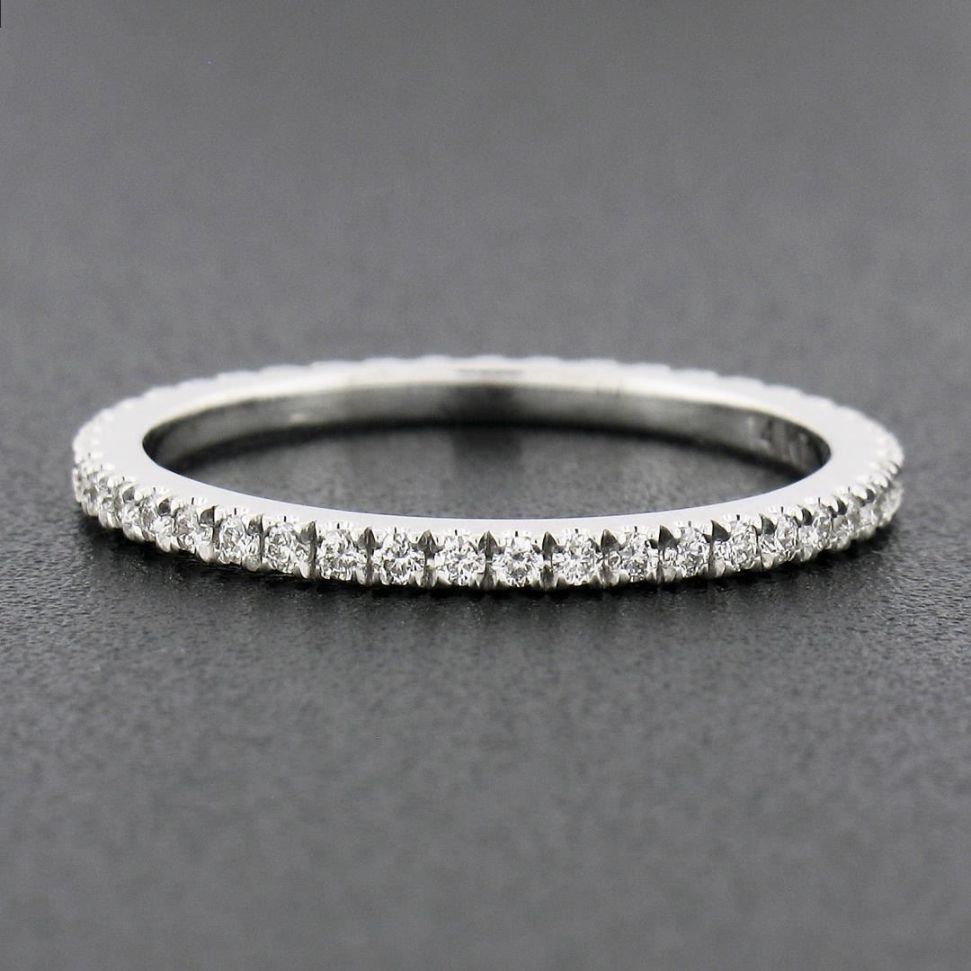 A solid 14k white gold band ring, with 43 round brilliant cut natural diamonds (F/G - VS1/VS2 ; 0.33ctw). The ring is size 6.5, weighs a total of 1.50 grams, and measures 1.5mm wide.
