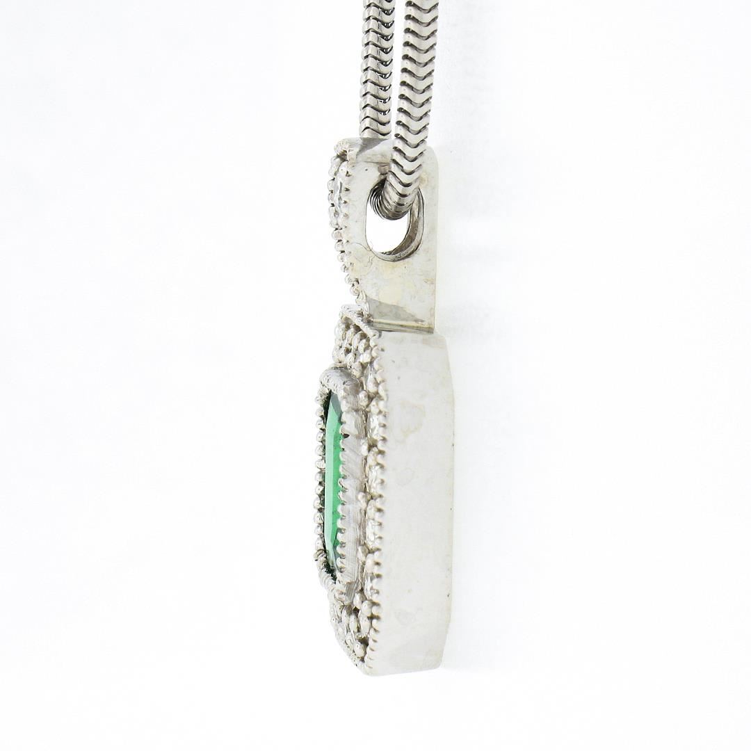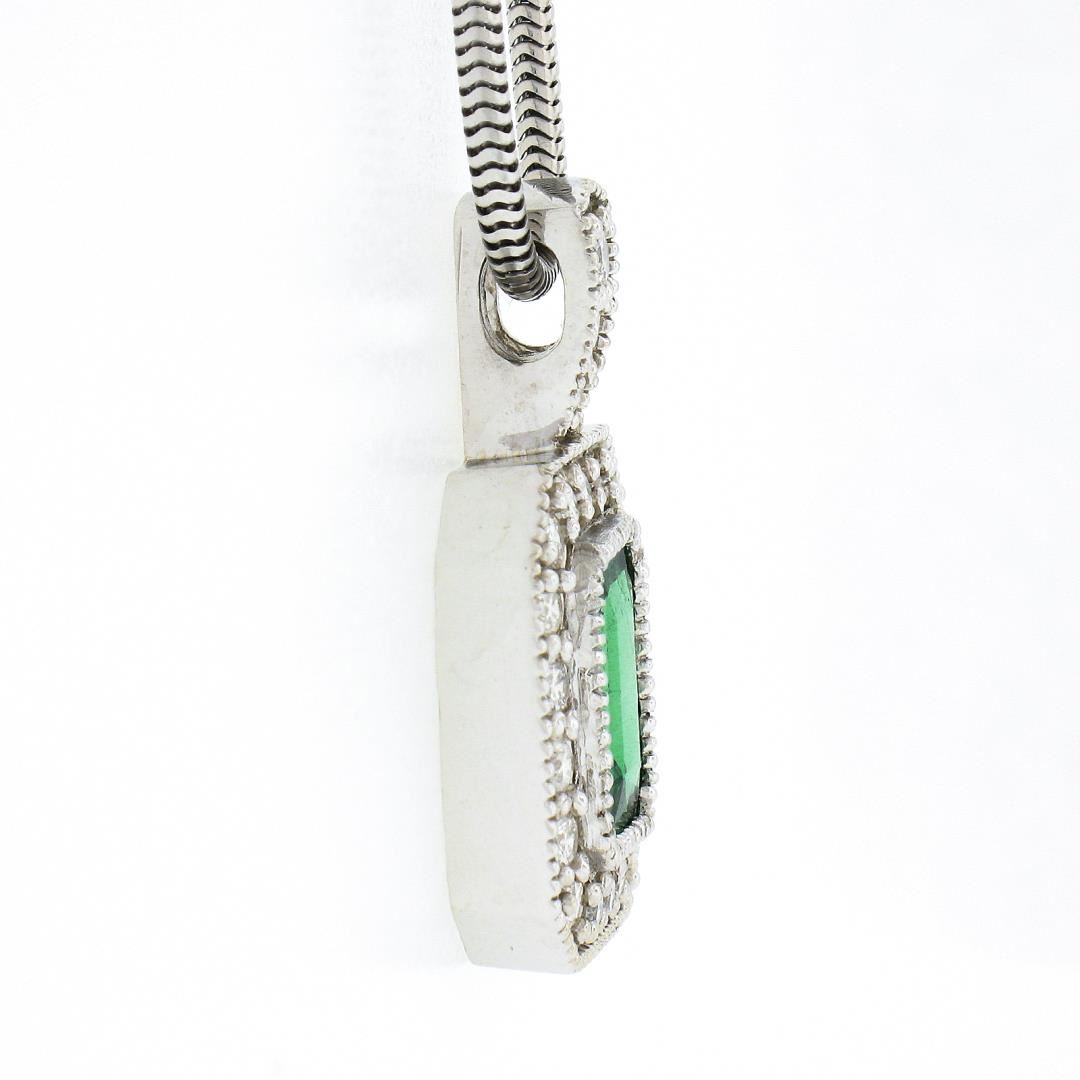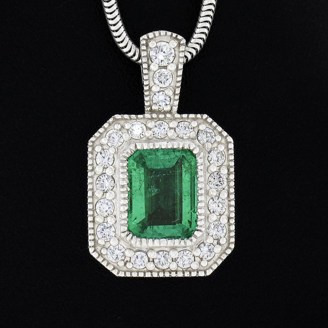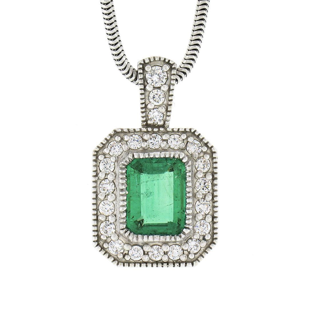 A solid 14k white gold pendant necklace, featuring 1 GIA graded emerald cut natural emerald (2.09ct), and 21 round brilliant cut natural diamonds (G/H - VS1/VS2 ; 0.65ctw). 18 inch snake link chain, 12.15 grams total weight, pendant measures 25.8x15.45mm. Comes with all original relevant certifications.