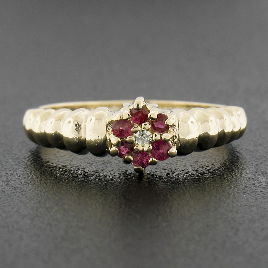 A sp;od 14k yellow gold floral ring, with 1 old single cut natural diamond (G - SI1 ; 0.02ct ), surrounded with a halo of 6 round cut natural rubies (0.12ctw). The ring is size 6.5, weighs a total of 2.54 grams, and measures 6.6mm wide.
