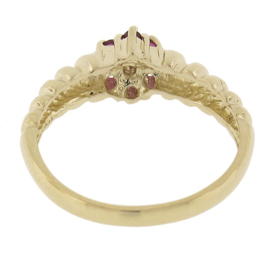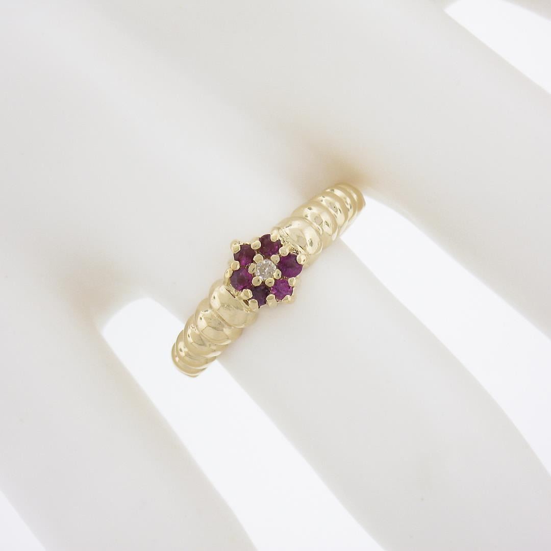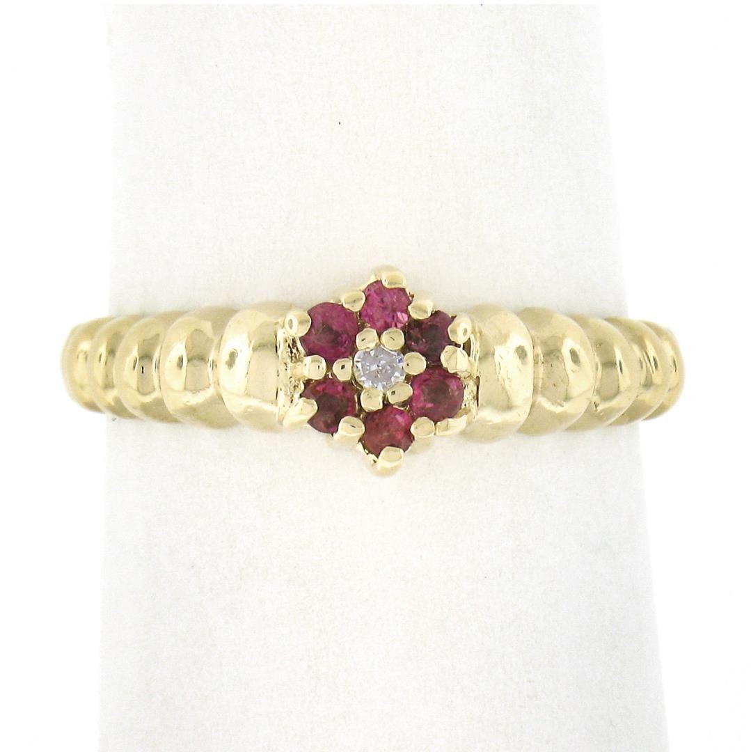 A sp;od 14k yellow gold floral ring, with 1 old single cut natural diamond (G - SI1 ; 0.02ct ), surrounded with a halo of 6 round cut natural rubies (0.12ctw). The ring is size 6.5, weighs a total of 2.54 grams, and measures 6.6mm wide.
