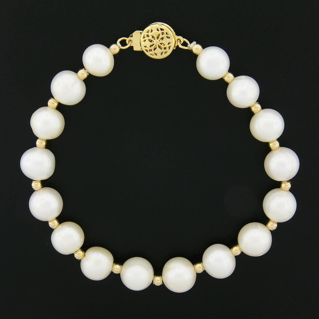 A solid 14k yellow gold clasp & bead spacers bracelet, with 16 round shape cultured pearls (8.5mm to 9.4mm each). It weighs a total of 16.47 grams, measures 9.4mm wide, and measures 6.5 inches in length.