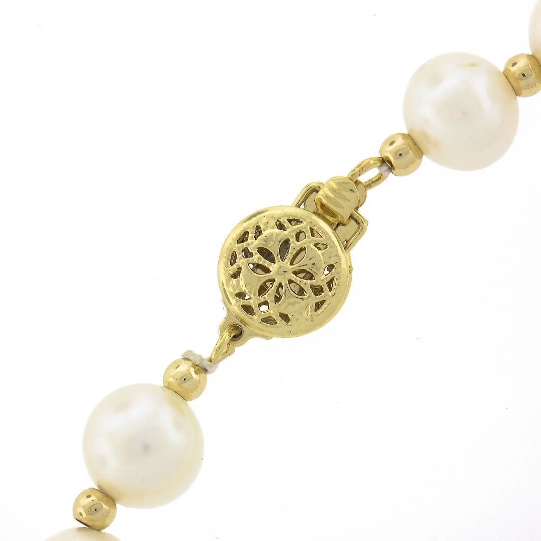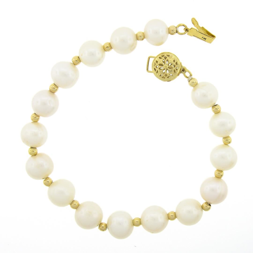 A solid 14k yellow gold clasp & bead spacers bracelet, with 16 round shape cultured pearls (8.5mm to 9.4mm each). It weighs a total of 16.47 grams, measures 9.4mm wide, and measures 6.5 inches in length.