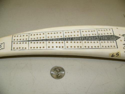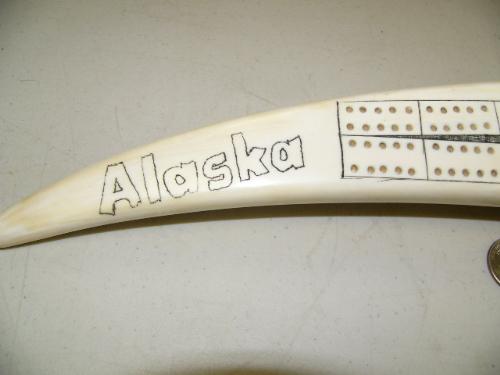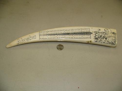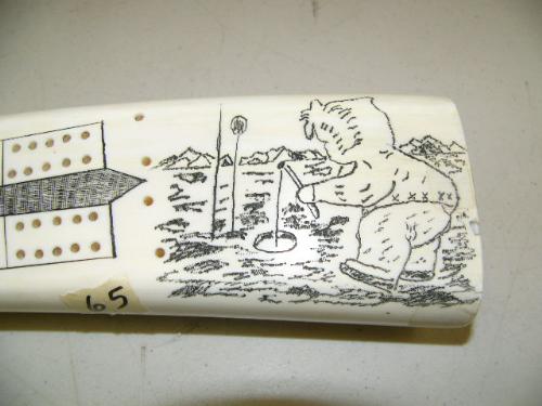 15.5" walrus ivory tusk cribbage board, scrimshawed with man fishing in AK, posts in end (2)